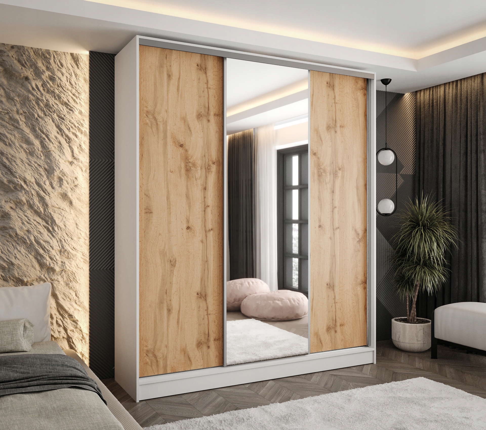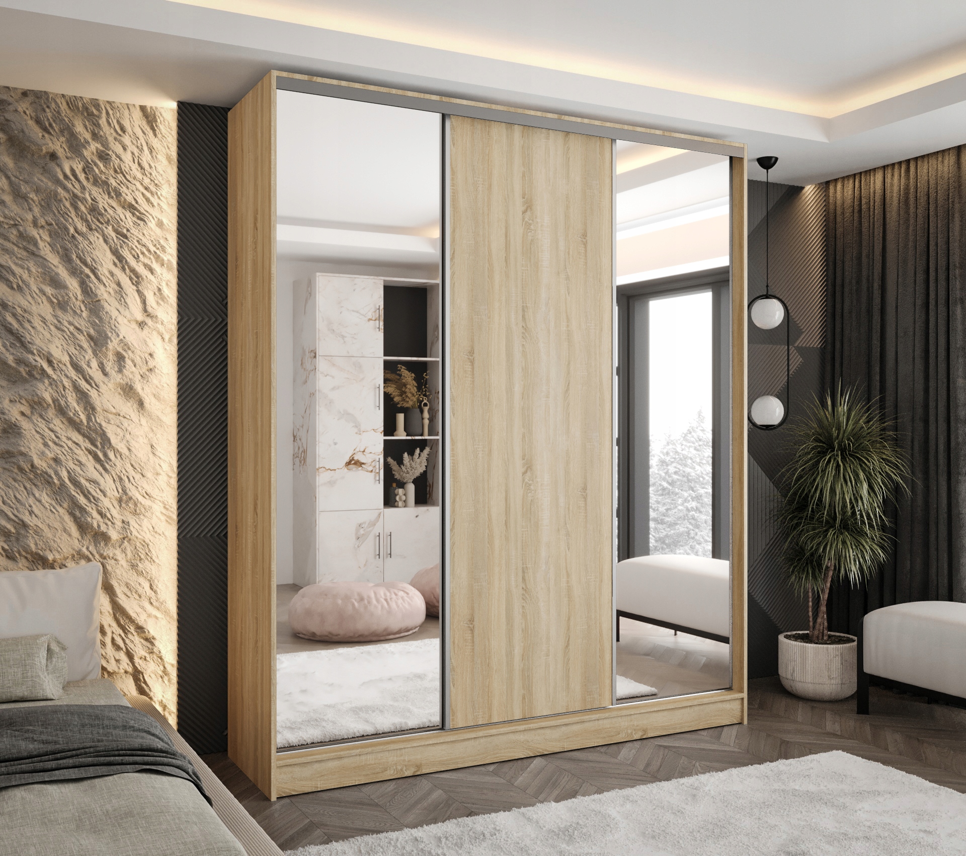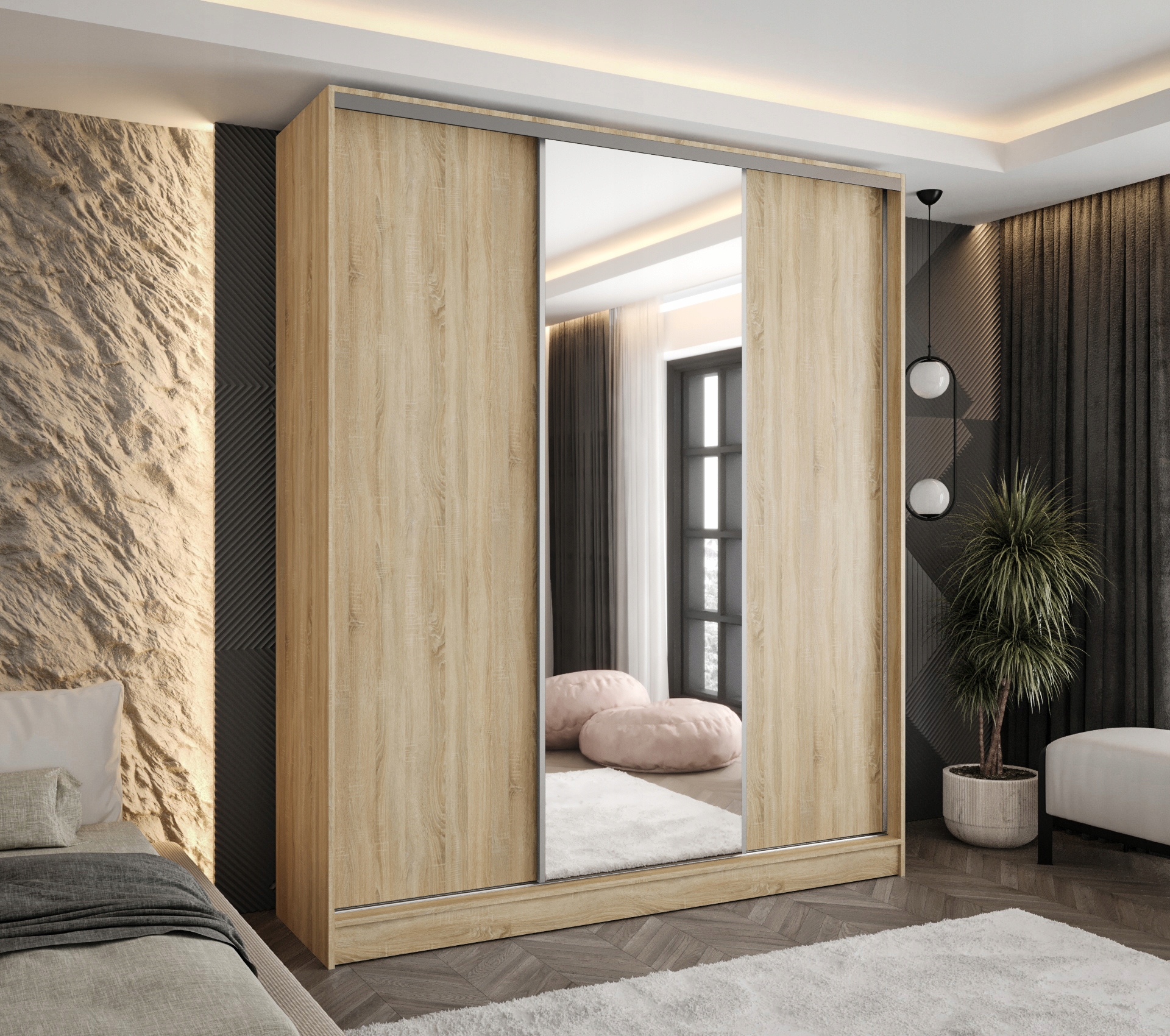 Розсувний гардероб у декорі Сонома з одним дзеркалом на передній частині - це гармонійне поєднання природної естетики з сучасною функціональністю. Яскрава дерев’яна обробка приносить інтер’єру тепла та затишку, що надає меблям позачасового, універсального персонажа. Дзеркало, розміщене на одній передній частині, не тільки має практичну функцію, але й оптично збільшує простір і освітлює приміщення. Це ідеальний вибір для спальні, гардеробу чи передпокою - пропонуючи елегантний вигляд, натхненний природою та щоденним комфортом використання.