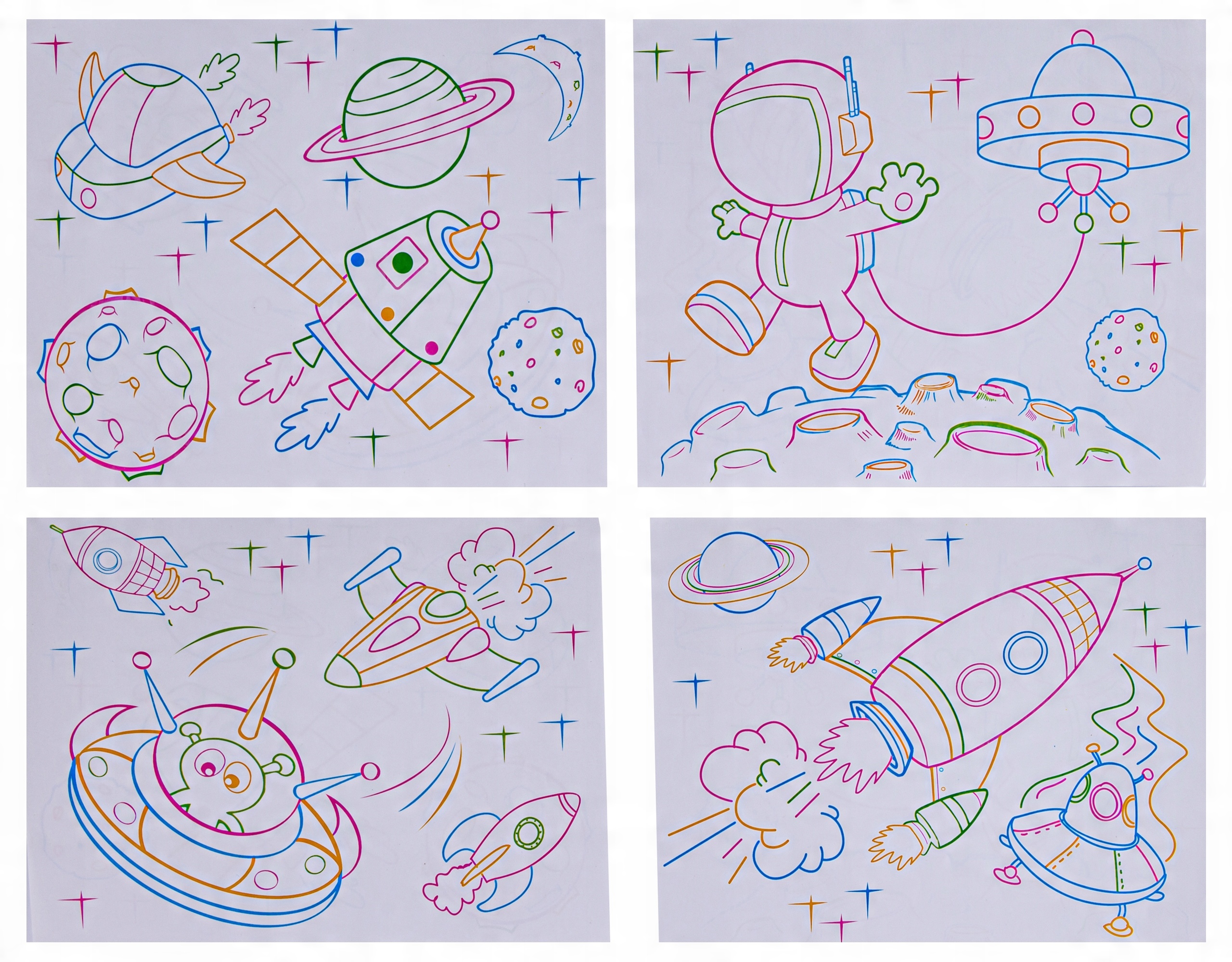 У набір входять 3 двосторонні шаблони з зразковими просторовими малюнками. Розмістивши їх під основною панеллю для малювання, їх можна обвести та розфарбувати. Після закінчення роботи вставляємо панель в основу і підсвічуємо. Чудовий ефект гарантовано.