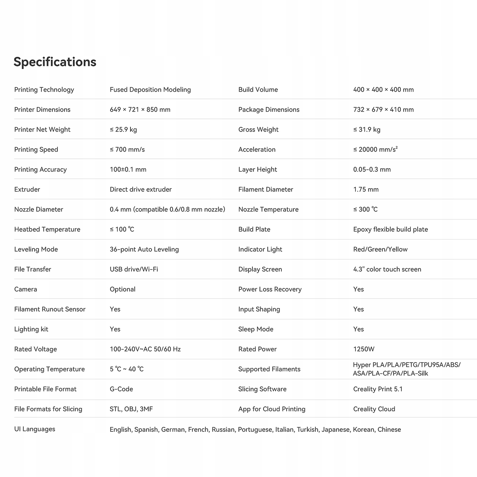 3D-принтер Ender-5, повністю автоматична, рівна друкарська платформа, швидкість друку 700 мм/с, робочий том 400*400*400 мм, підтримка з'єднання WLAN, контроль багатьох машин, придатні для нитки з діаметром 1,75 мм, гіпер PLA/PETG/PETG/TPU95A/ASSA/ASA/PLA-CCF/PALE/HLEK <1