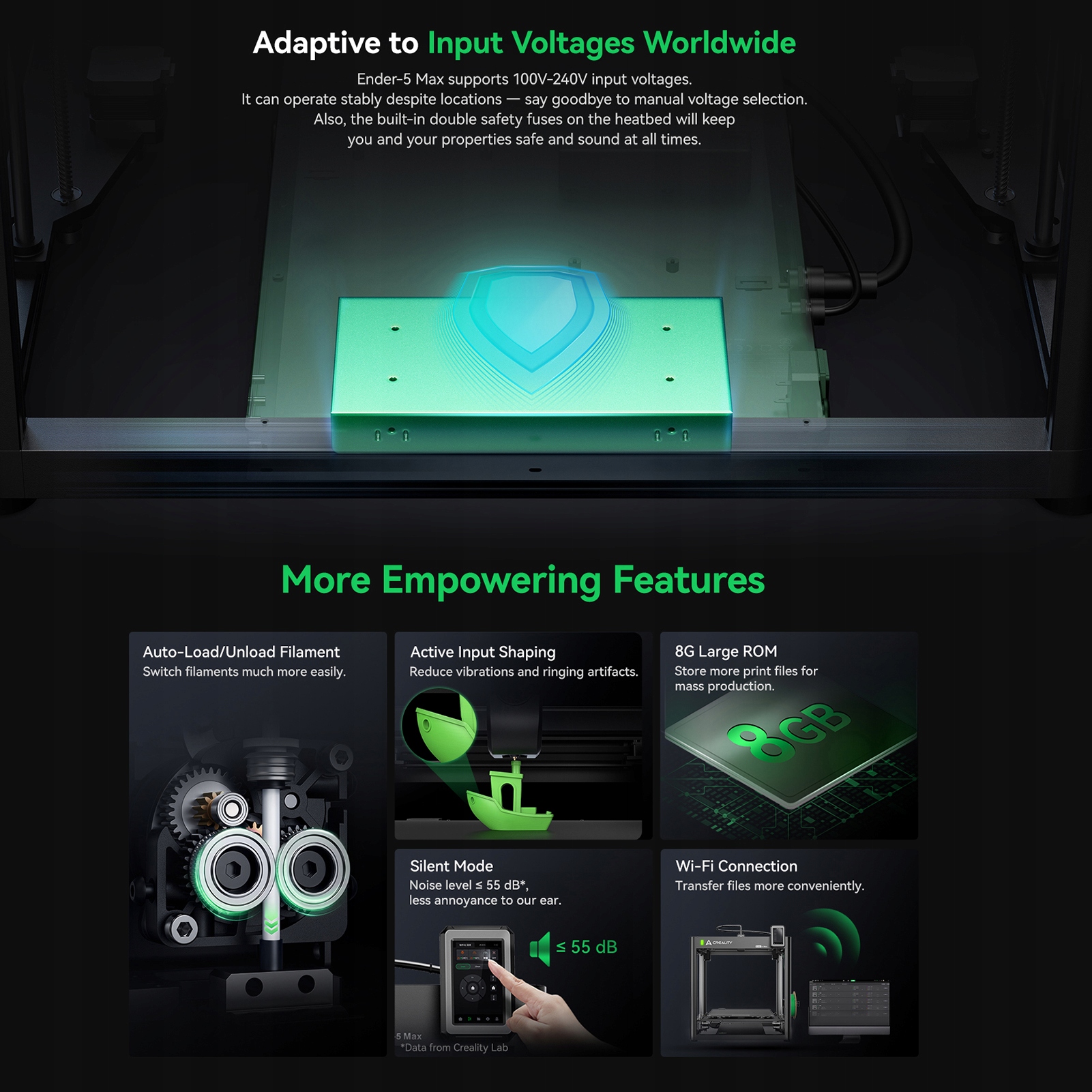 2. У поєднанні з величезним робочим простором 400x400x400 мм Ender-5 Max досяг вражаючого результату, чи не друкує ви невеликі деталі на вечірках, чи хочете ви створити величезну модель в одному шматці, Ender-5 Max зробить його в мить ока. Побудований нагрівач 1000 Вт може нагрівати алюмінієву робочу таблицю до 80 ℃ (максимум 100 ℃) всього за 200 секунд. Тепер ви можете почати виробництво швидше і витратити менше часу на очікування. Зовсім нова робоча стоянка з епоксидної смоли забезпечує зниження адгезії до таблиці, підвищуючи загальну енергоефективність. Нова робоча табличка також гнучка, тому ви можете легко підібрати готові роздруківки.