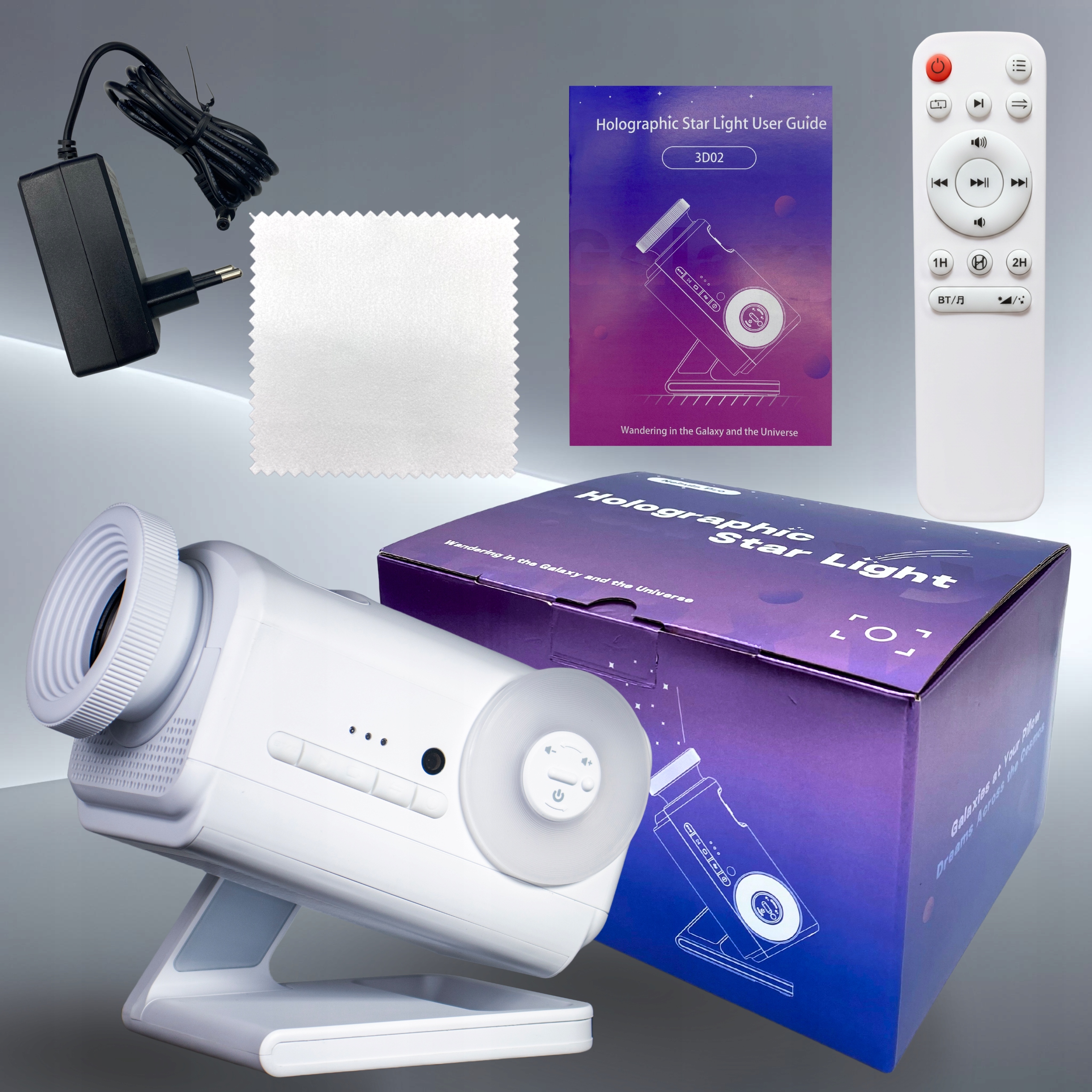 - Набір включає: голограмний 3D-проектор, живлення Адаптер, пульт дистанційного керування, серветка для очищення лінз, посібник користувача