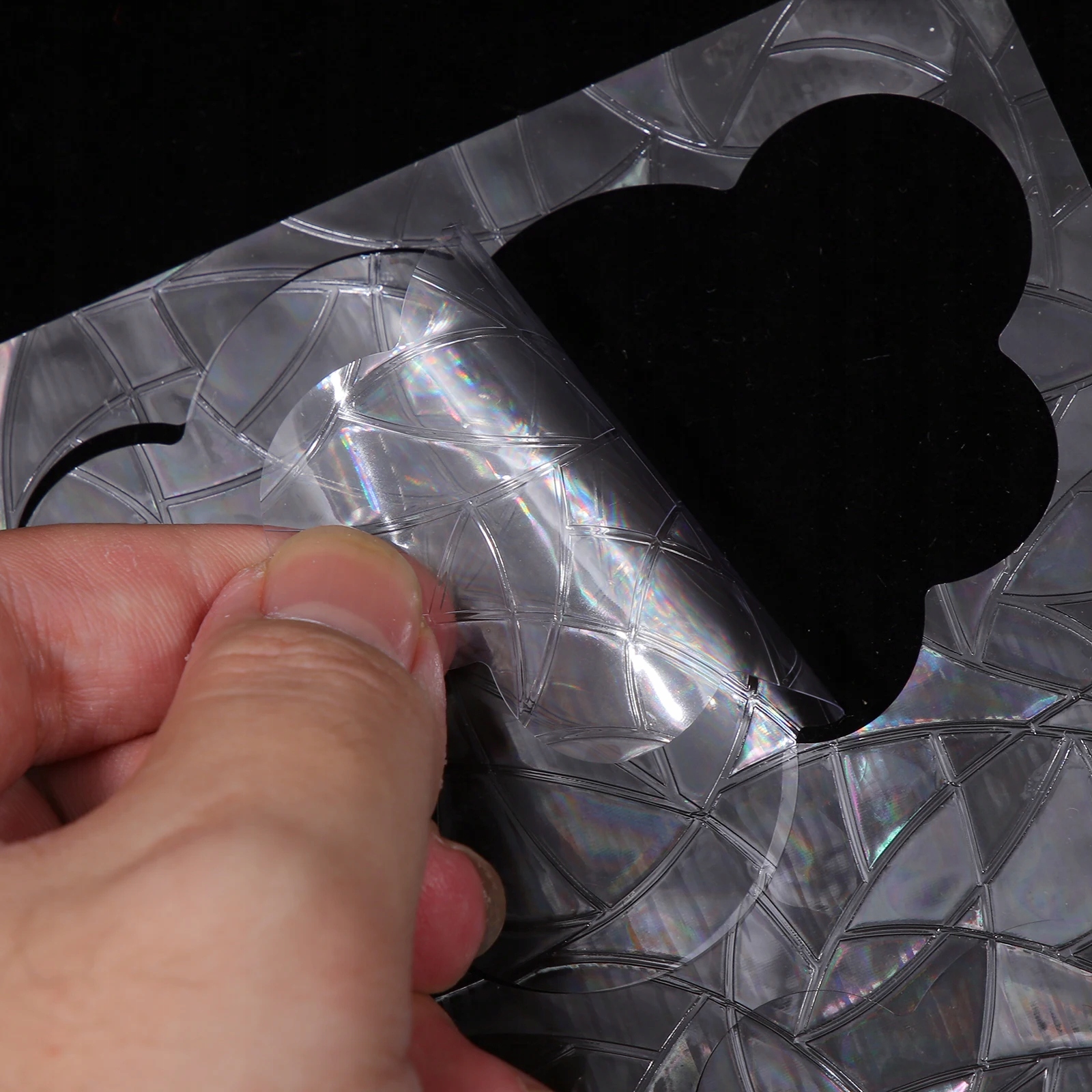 Ці наклейки статичні. Просто зніміть папір-підкладку, бризніть водою на скляну поверхню та нанесіть клей для скла.