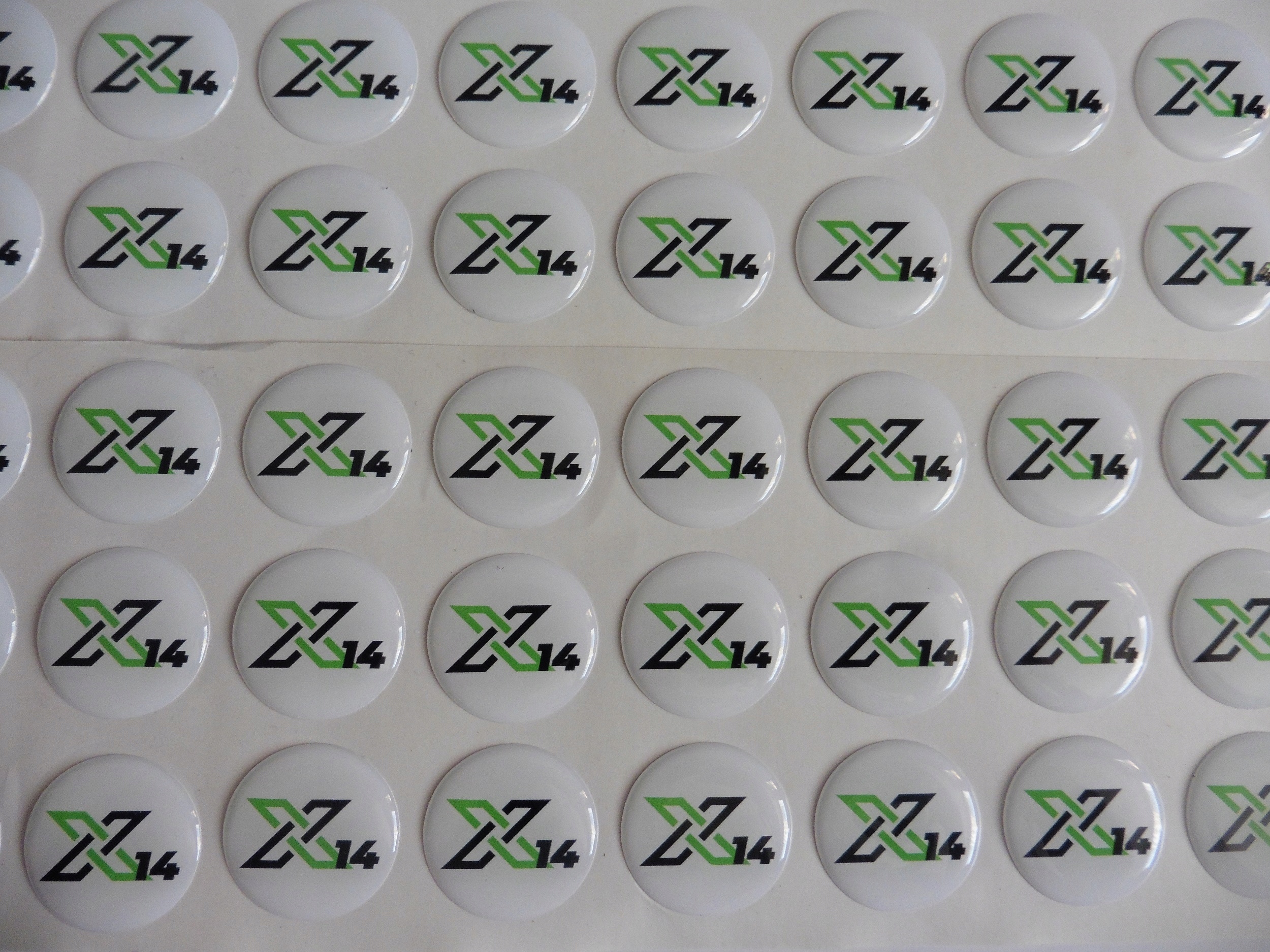 Друк 4+0 CMYK відбиток вирізається за допомогою плотера в потрібну форму. Потім його покривають прозорою смолою. Через фізичні властивості смоли малюнок не може містити гострих кутів – усі кути мають бути закругленими (мінімальний радіус заокруглення кожного кута становить 1 мм).