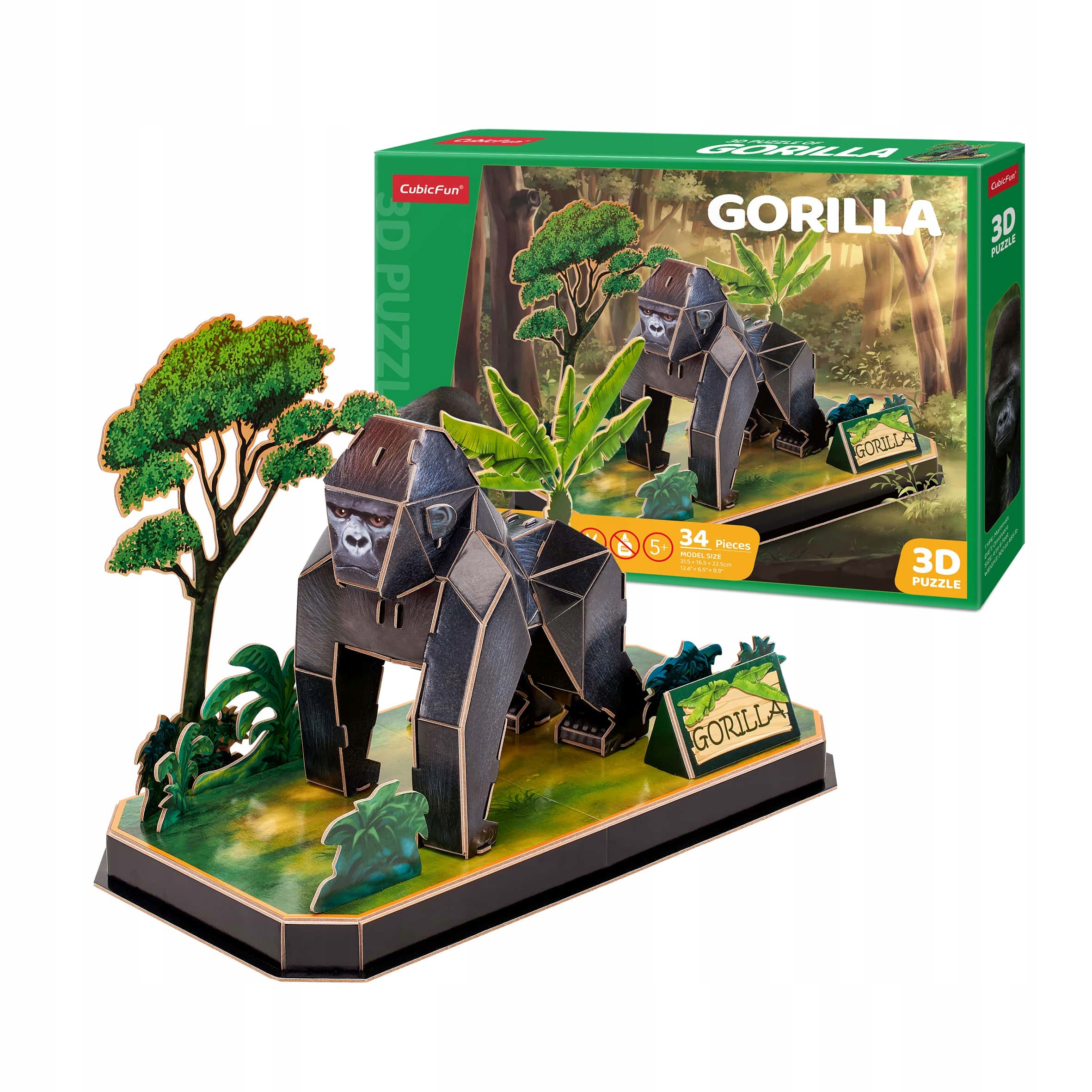 3D-головоломка Cubic Fun, за допомогою якої можна створити горилу. Горила складається з 34 елементів і в зібраному вигляді має розміри 31,5x16,5x22,5 см. Для складання моделі не потрібні клей, ножиці чи будь-які спеціальні інструменти. Пазли виготовлені з попередньо нарізаного паперу та пінокартону, який безпечніший за метал та дерево, реалістичніший та легший за пластик. Ілюстрований посібник дозволяє юним дизайнерам самостійно будувати моделі.