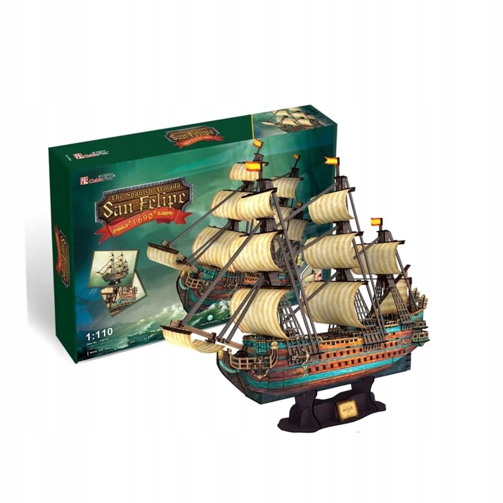 3D ПАЗЛ ВІТРИЛЬНИЙ КОРАБЕЛЬ САН ФЕЛІПЕ - НАБІР XL - це захоплююча розвага для дітей і колекціонерів кораблів і кораблів. В упаковці 248 ЕЛ. пазли зі спеціального піноподібного матеріалу. Пазли пронумеровані, розрізані та розміщені на аркушах. Просто витисніть елемент з листа, не застосовуючи сили, і зберіть його відповідно до інструкції, що додається, без використання клею та спеціальних інструментів. Розмір корабля в складеному вигляді 68 х 18 х 56 см. Рекомендований вік дитини 8+.
