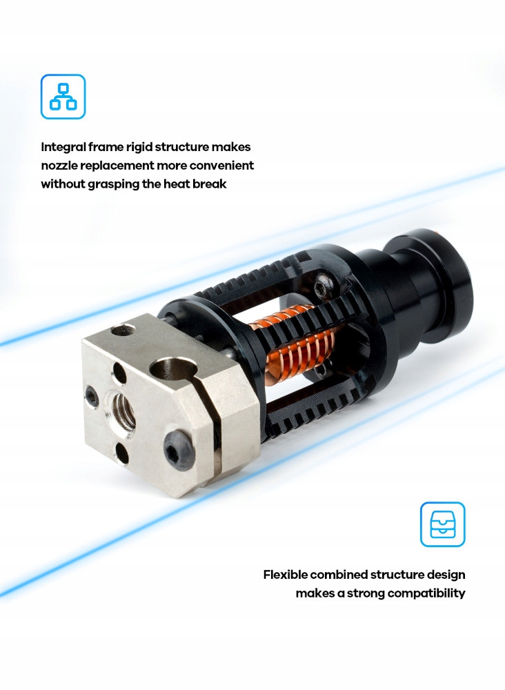 Використання ультра тонкої стінки теплової (0,1 мм) та точно обробленого внутрішнього каналу (шорсткість ≤ ra0,3) тепло і мінімізує ризик перегріву нитки. Крім того, посилена, жорстка конструкція захищає компоненти HOTND від механічних пошкоджень, що робить заміну насадки швидким і без проблем.
