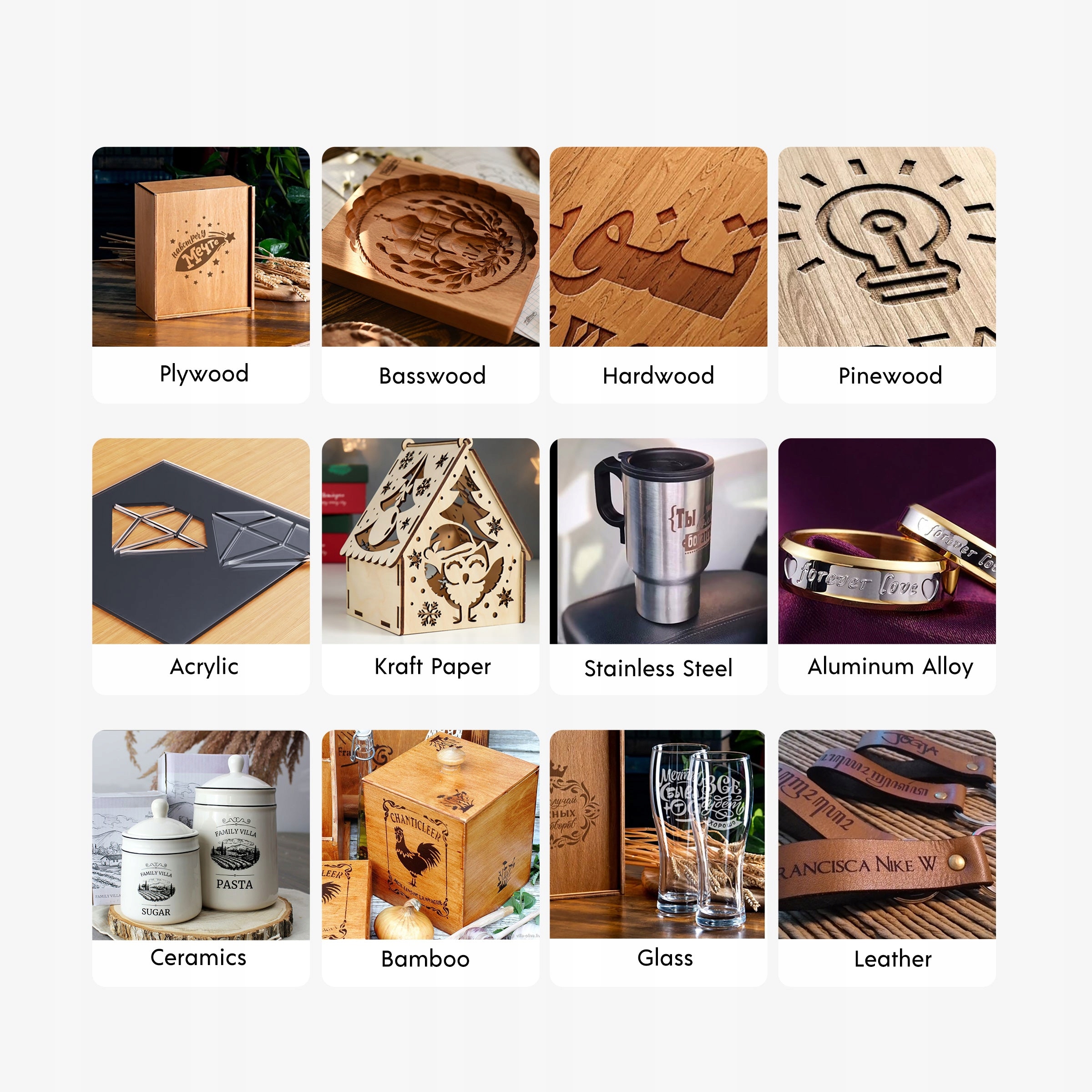 Підтримувані матеріали для гравіювання: дерево, папір, пластик, шкіра, друковані плати, оксид алюмінію, невідбиваючі екрани та пофарбований метал тощо.