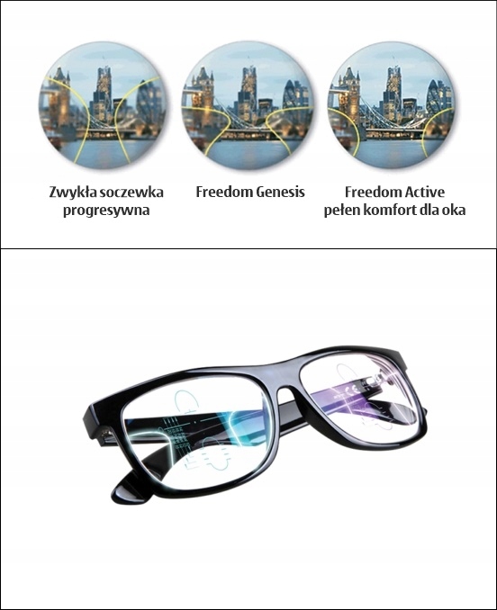 Лінзи Freedom Active є першими прогресивними лінзами у світі, який забезпечує ідеальний комфорт у всіх трьох зонах огляду: на відстані, проміжному та поблизу. Завдяки використанню новітньої 3D-технології та інноваційній концепції прогресивні лінзи Freedom Active мають сегмент шириною 5 мм із постійною силою для ідеального зору на проміжні відстані. Створення такого сегмента з постійною, незмінною потужністю дозволило розширити канал на проміжних відстанях більш ніж на 100% порівняно з іншими прогресивними лінзами, доступними на ринку. Лінзи Freedom Active дають вам безпрецедентне природне спонтанне бачення.