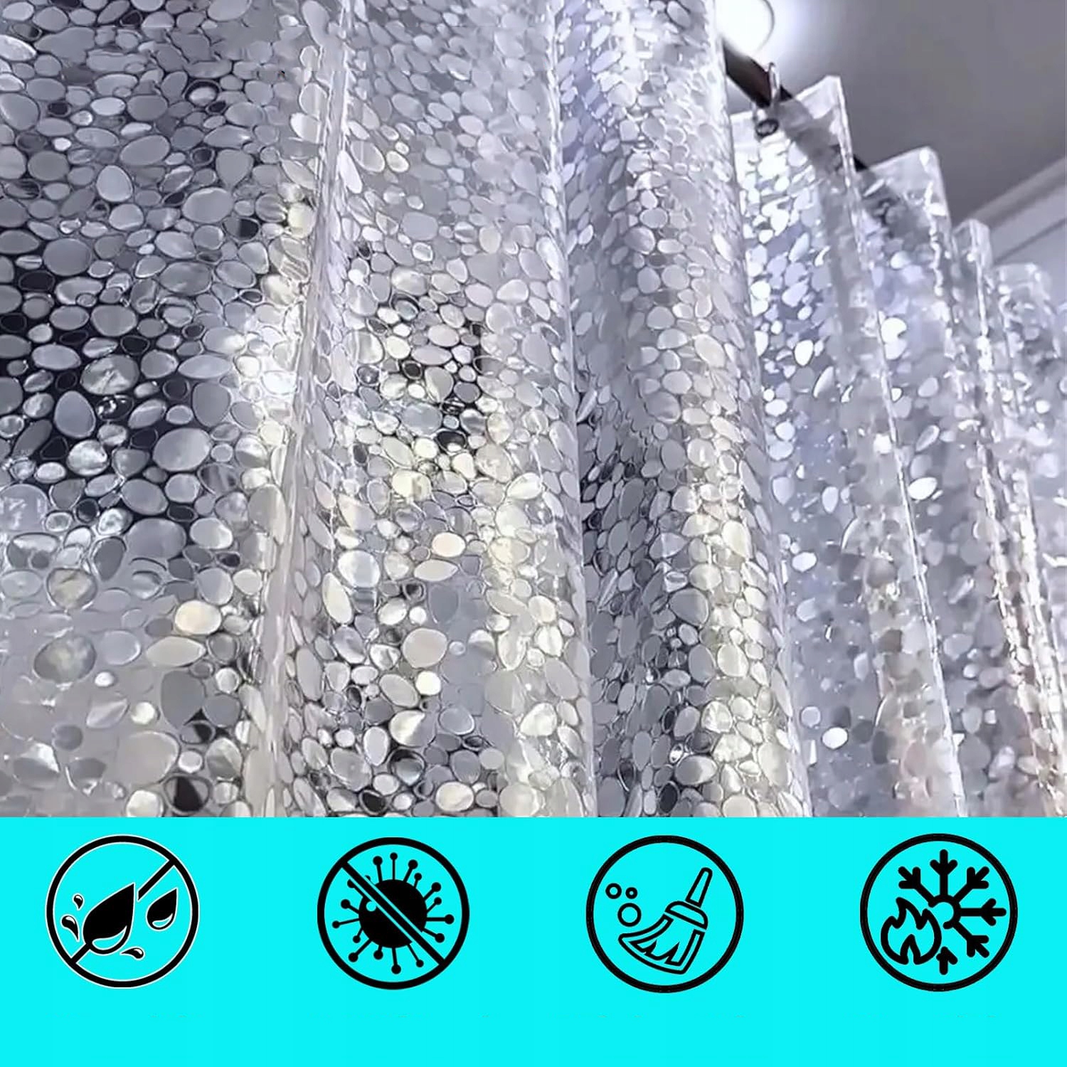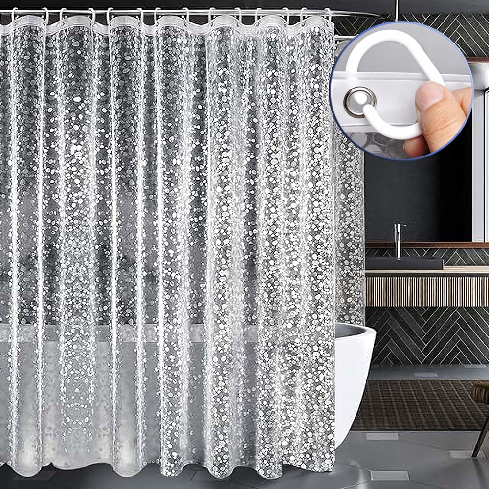 🚿🚿🚿【Високоякісний матеріал】3D-напівпрозора шторка для душу виготовлена з матеріалу EVA, ПВХ і BPA. Високоякісний матеріал EVA забезпечує анти-пліснявові та антибактеріальні властивості, ефективно запобігаючи розвитку цвілі та бактерій. Напівпрозорий 3D-візерунок камінчиків добре захищає вашу конфіденційність.