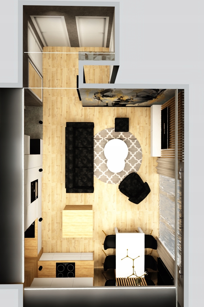 - Дизайн вітальні з кухнею 20 м2 коштує 20 м2 x 85 злотих за м2 = 1700 злотих