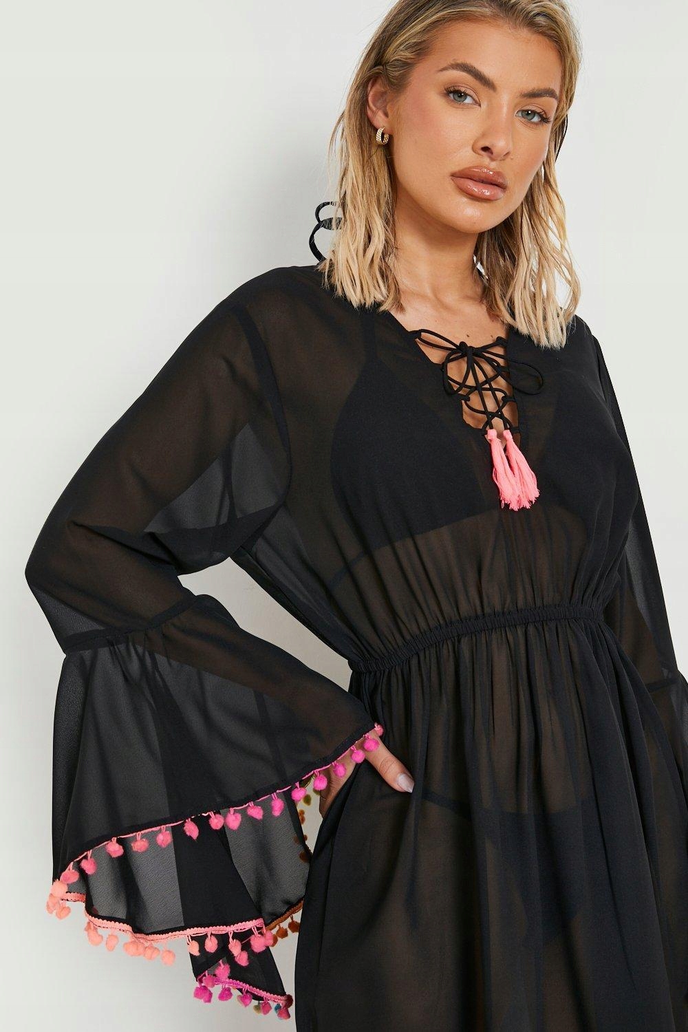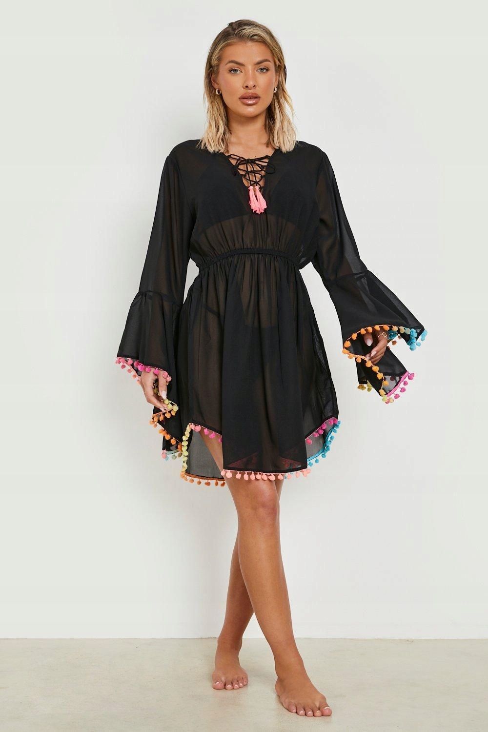 3F5A62 P32 BOOHOO BLACK BEACH TUNIC з XS Pompoms