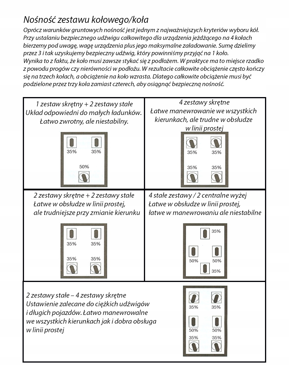 Колесо має завжди контактувати з землею. На практиці це рідко трапляється через пороги або нерівності землі. У результаті загальне навантаження часто потрапляє на три колеса, а тому навантаження на колесо збільшується. Це означає, що для досягнення безпечної вантажопідйомності загальне навантаження потрібно розділити на три колеса, а не на чотири.