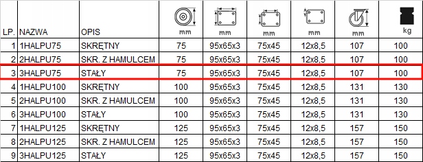 - КОЛЕСО складається з алюмінієвої втулки та поліуретанової шини, має подвійну кулькову опору. Колесо має вантажопідйомність 100 кг. Вони повільно зношуються, стійкі до пошкоджень, поглинають удари та вібрацію. Вони плавно обертаються на твердих і гладких поверхнях, як-от бетон, із дуже незначним тертям.
