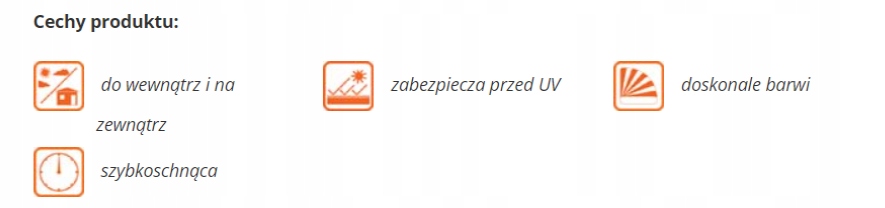 дає атласне покриття, яке захищає деревину від впливу погодних умов, характерних для польського клімату (мороз, волога та УФ). Завдяки швидкій формулі, першому шару сухий на дотик через 20 хвилин, а через 2 години він залишається на пофарбованій поверхні навіть під час змінних погодних умов (включаючи дощ).