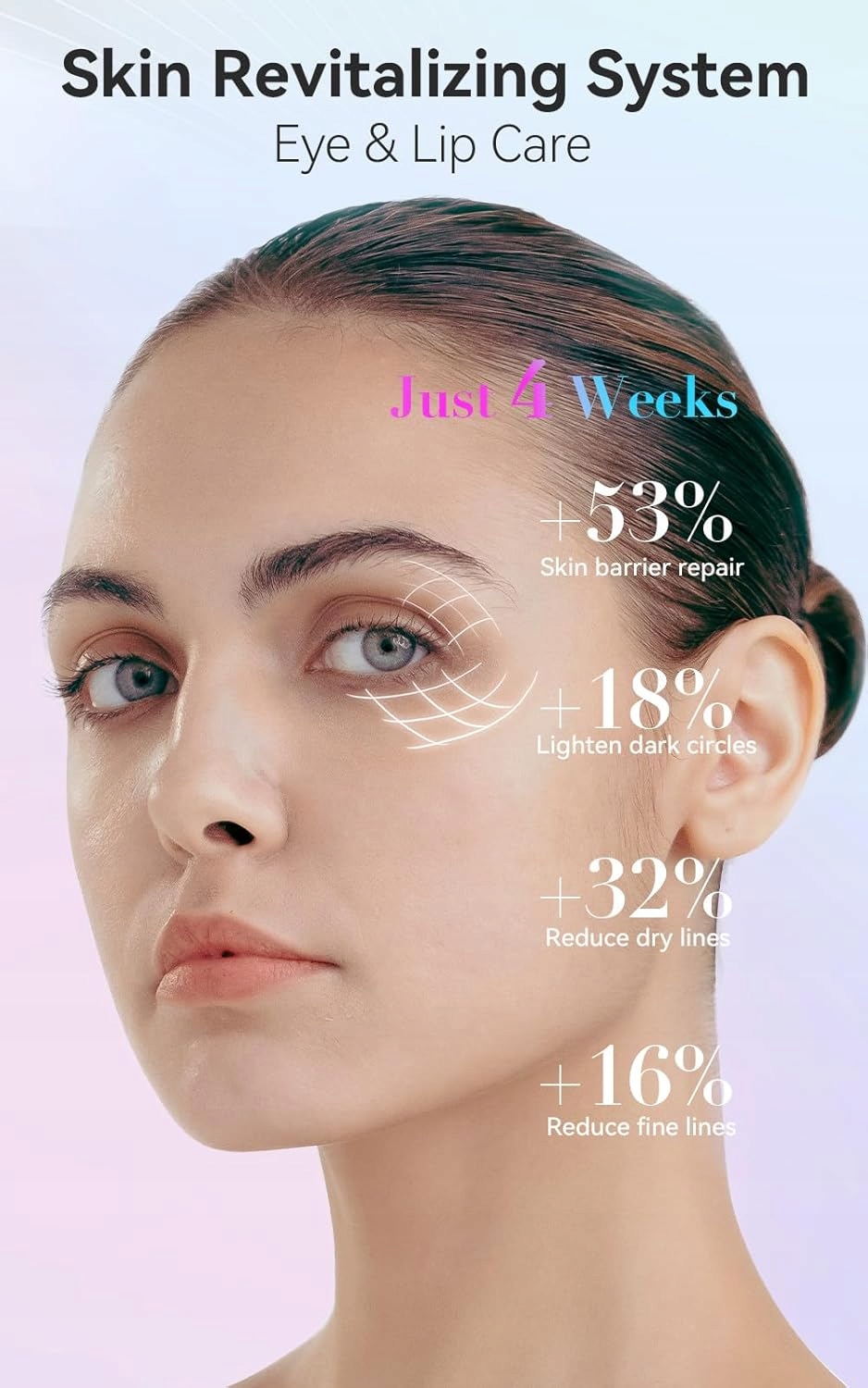 - Теплий масаж + вібрації Sonid - високі частоти вібрації збільшують приплив крові до очей. Теплий масаж при 38-42 ° С підтримує кровообіг і засмічує пори, щоб забезпечити більш ефективне поглинання крему очей або сутності під очима.