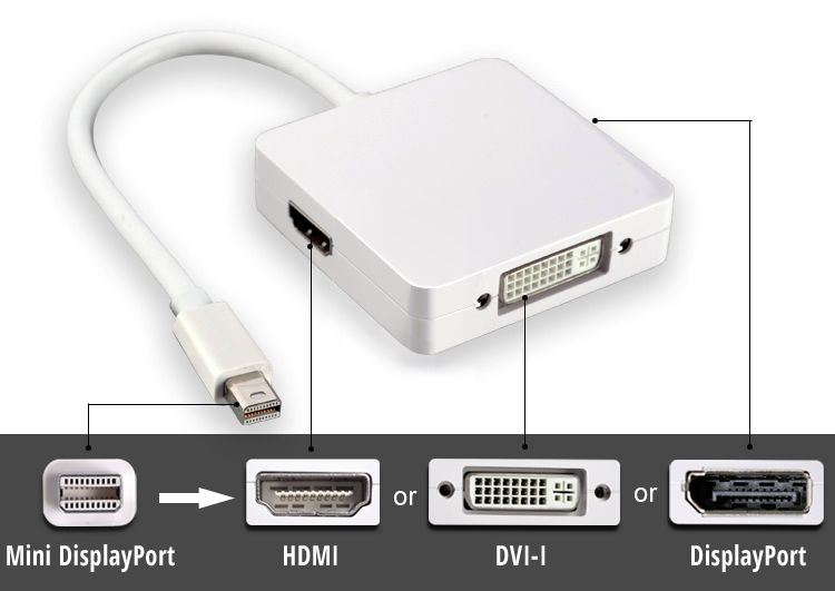 адаптер дозволяє підключити ноутбук з міні -розеткою Displayport (Thunderbolt) до пристрою з DVI, HDMI або DisplayPort.