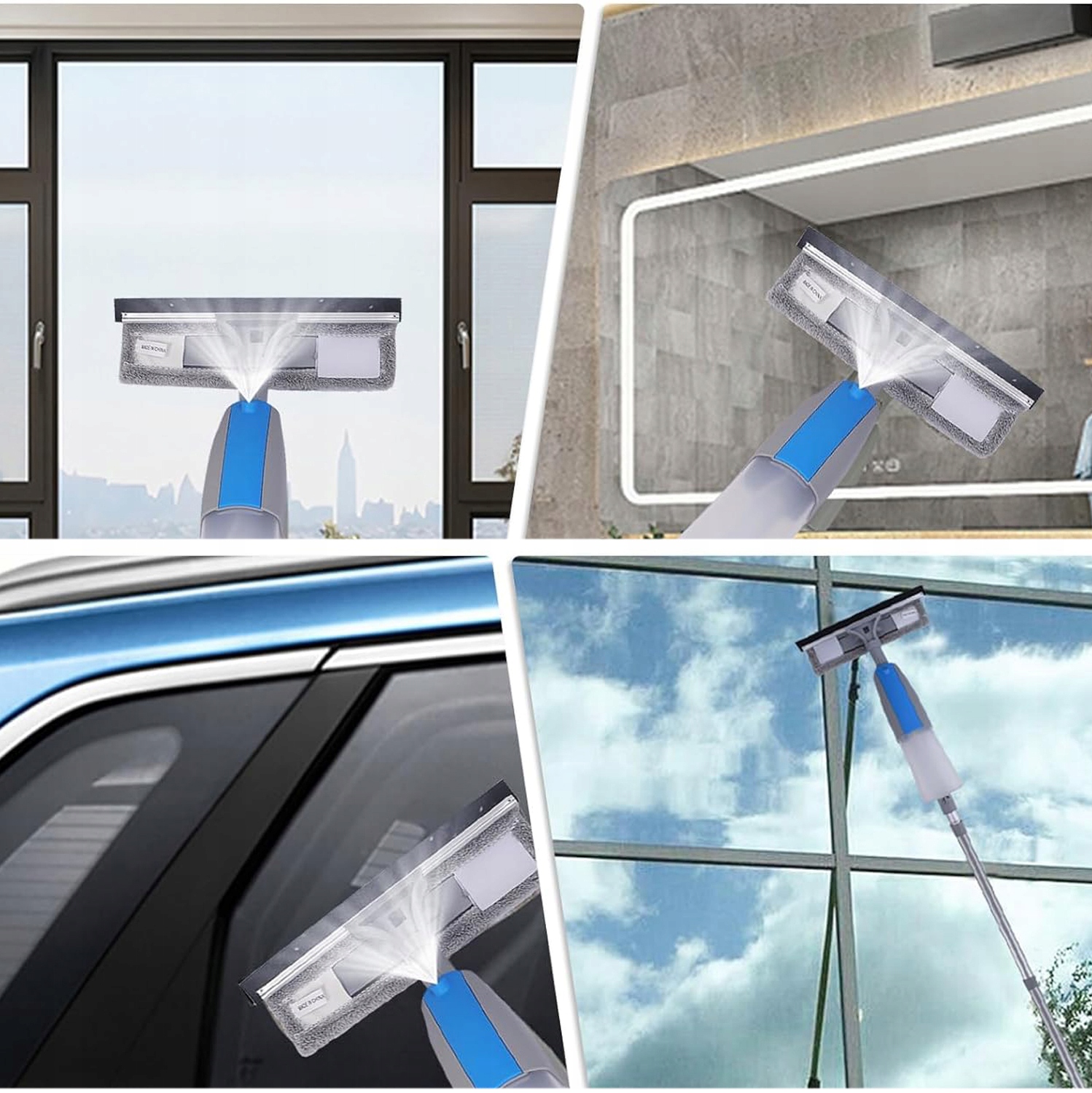- Цей інструмент для очищення вікон оснащений пляшкою, 2 скребками та 2 тканинами для мікроволокна і може ефективно чистити високі вікна всередині та зовні душі, автомобілі, дзеркальні, плитові стіни та не тільки.