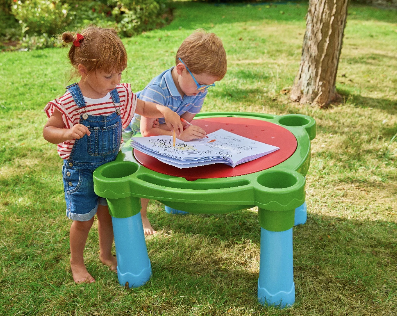 Стіл має дві ігрові поверхні. Перший має два відсіки - один для піску, інший для води. Після кріплення кришки, яка також служить стільницею, стіл перетворюється на ідеальне місце для малювання, письма та гри з кубиками.