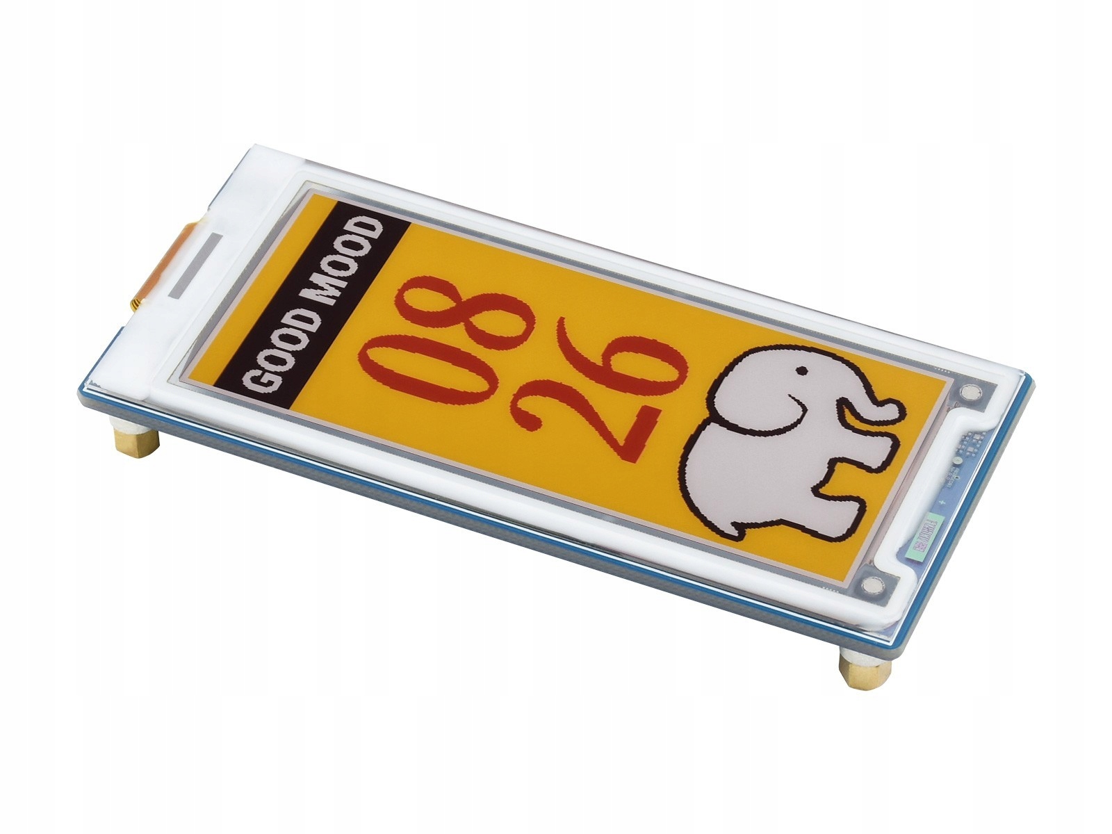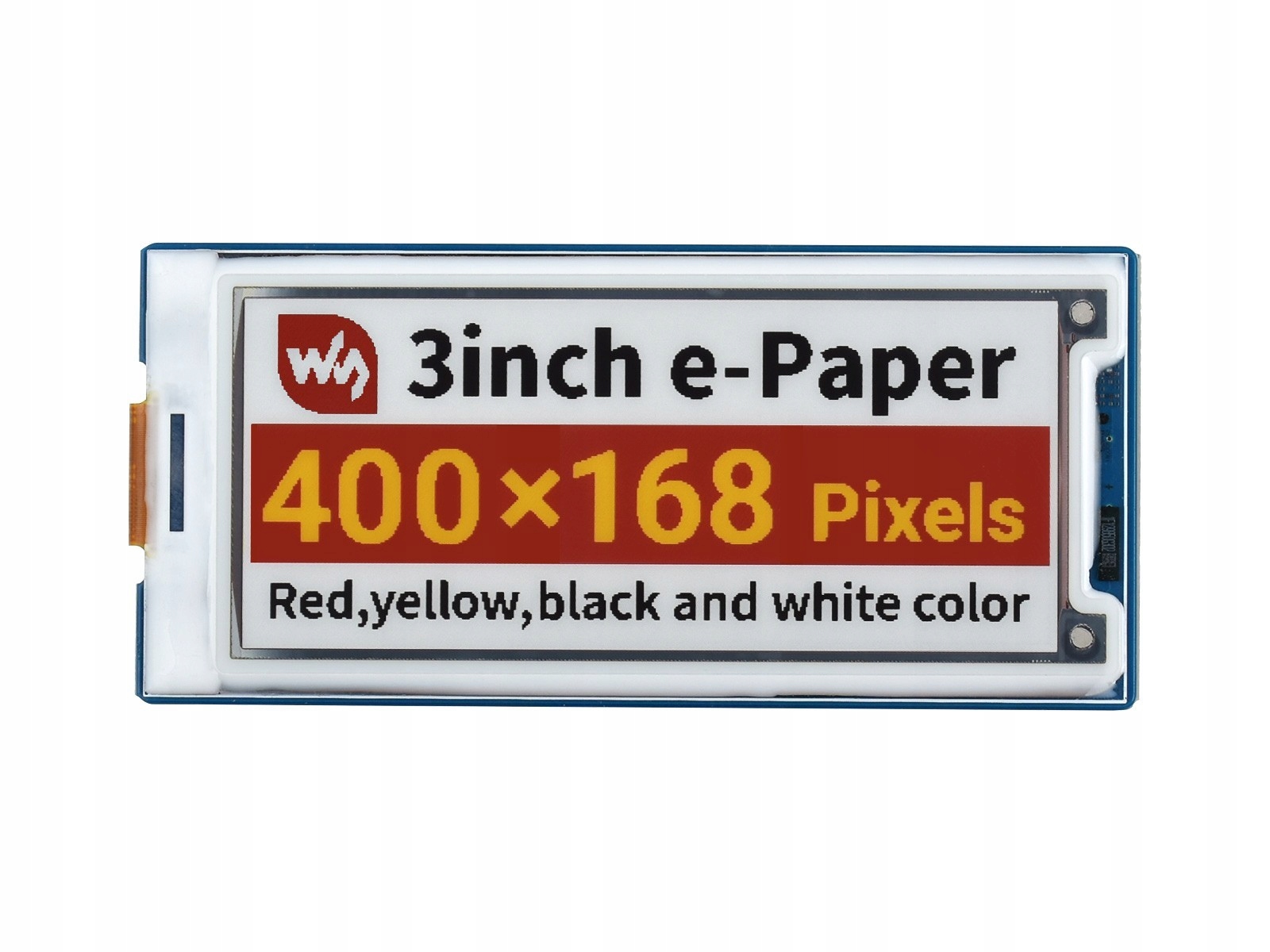 Модуль із 4-кольоровим дисплеєм (червоний, жовтий, чорно-білий) e-Paper дисплей з діагоналлю 3" і роздільною здатністю 400x168 пікселів. Він має можливість відображати вміст з дворівневою шкалою сірого, а вбудований контролер спілкується через інтерфейс SPI. Забезпечує широкий кут огляду. Дисплеї e-Paper характеризуються високою контрастністю відображуваного зображення та споживають електроенергію лише при зміні відображуваного вмісту. Він сумісний із системами 3,3 В і 5 В. Підтримка доступна на сторінці продукту у формі випадків використання з Raspberry Pi, Jetson Nano, Arduino та STM32.