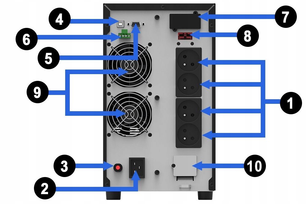 ☆ автономний ☆ баштовий ☆ онлайн ☆ LCD ☆ HID ☆ 6x 12V / 9Ah ☆ 4x FR (PL) ☆ Термінал ☆ EPO ☆ RS -232 ☆ USB ☆ PowerMaster