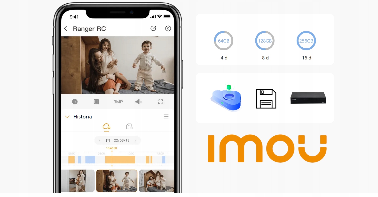IP-камера Imou Ranger RC 3mpx дозволяє записувати матеріал безпосередньо на карту пам’яті («d» кількість днів запису), на диск, розміщений в одному із сумісних записуючих пристроїв (потрібен протокол ONVIF) або в хмарі ( безкоштовний сервіс лише протягом 30 пробних днів).