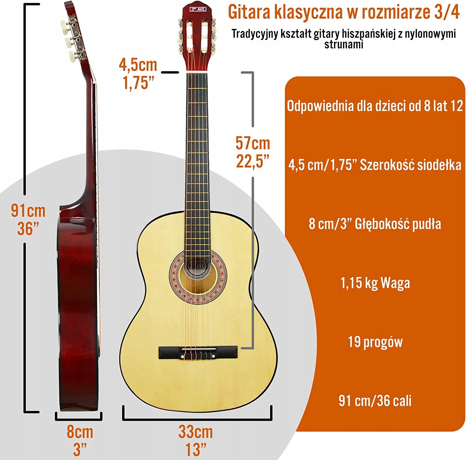 - РОЗМІР/СПЕЦИФІКАЦІЯ – Загальна довжина: 36”/91 см; Довжина шкали: 22,5”/57 см; Ширина ящика: 33 см; Кількість ладів: 19; Матеріал струн гітари: нейлон