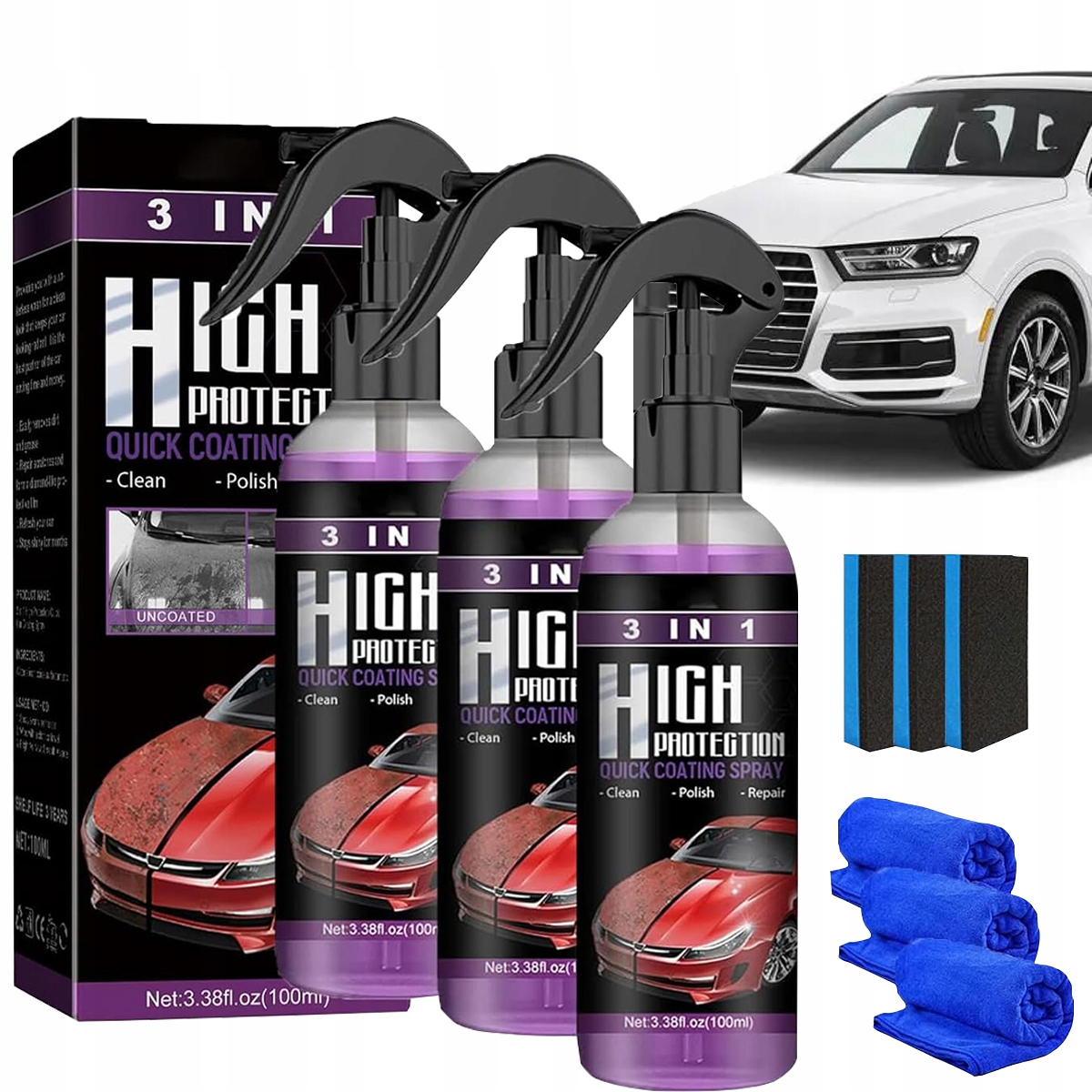 🔎✅ Спрей 3 в 1 з високим захистом, гідрофобний, швидковисихаючий, з керамічним покриттям для автофарби, 100 мл (губка і рушник в комплекті)🔎✅