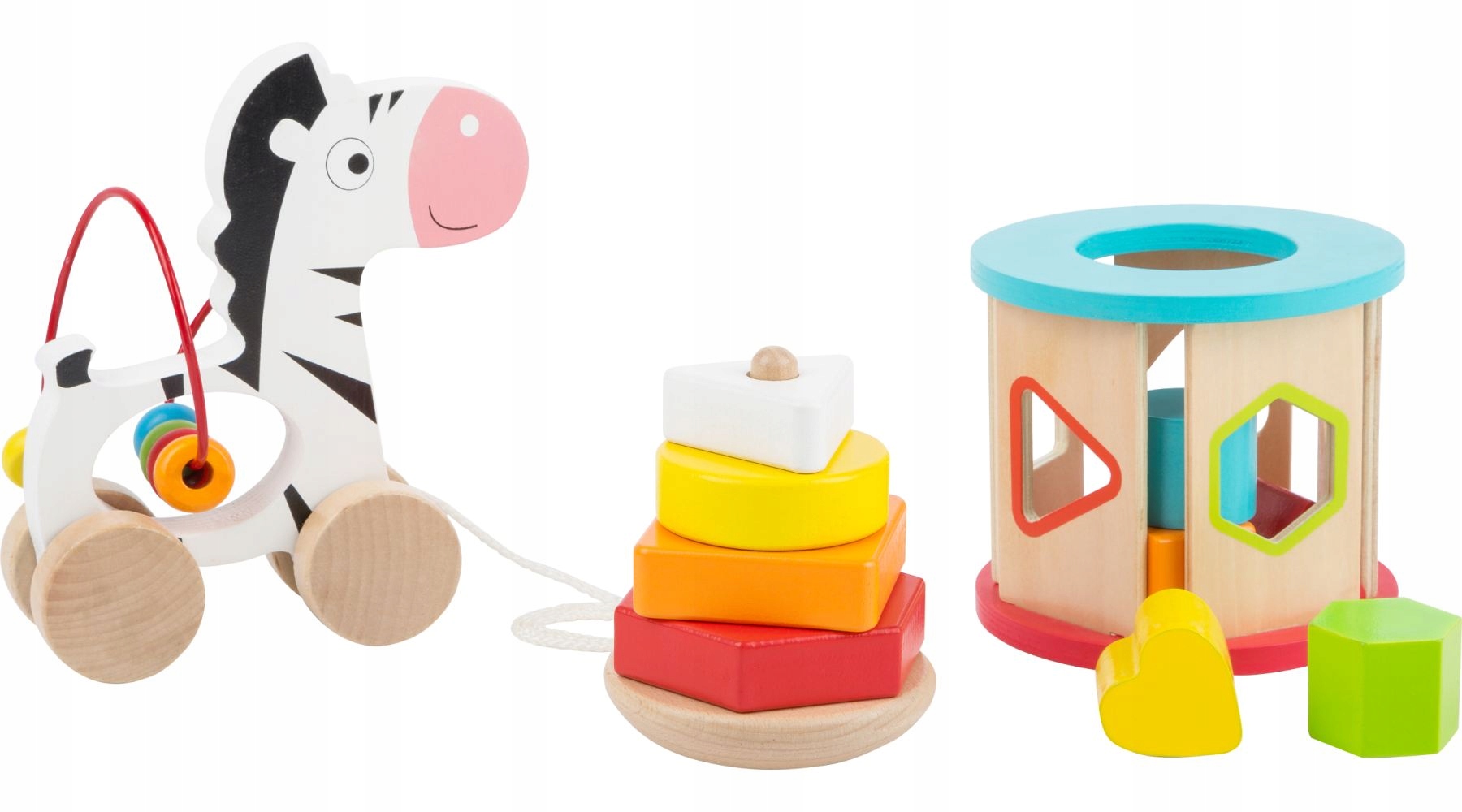 Цей набір : СОРТЕР, ПІРАМІДА ПІДКЛЮЧЕННЯ та приводне ребро з моторною ПЕТЛЕЮ. Усі 3 іграшки міцно та естетично виготовлені з дерева (тільки петля на зебрі металева) і гарно пофарбовані в яскраві, привабливі кольори.