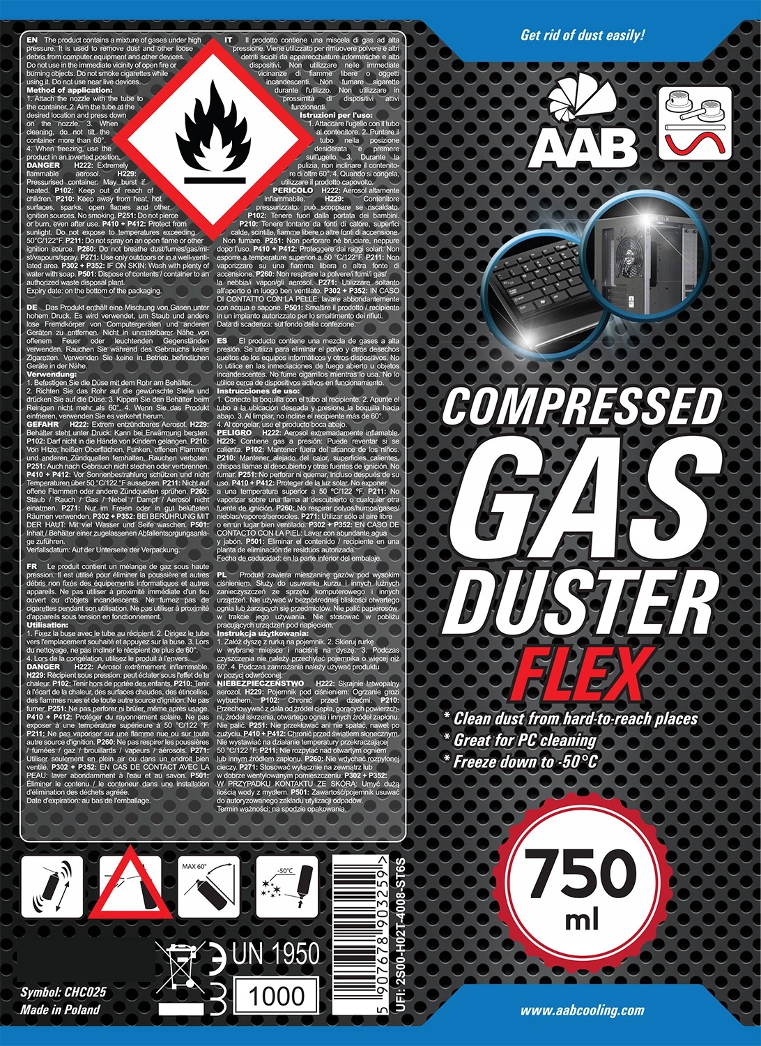 Щоб безпечно використовувати AABCOOLING Compressed gas duster FLEX, прочитайте паспорт безпеки та/або етикетку продукту та дотримуйтесь заходів безпеки: