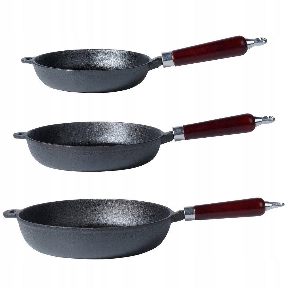 Вони мають ручки з високоякісного коричневого дерева. Чавунний посуд відмінно розподіляє тепло і довго зберігає високу температуру. Посуд міцний, масивний і довговічний. При правильному догляді - змащенні вони прослужать багато років.