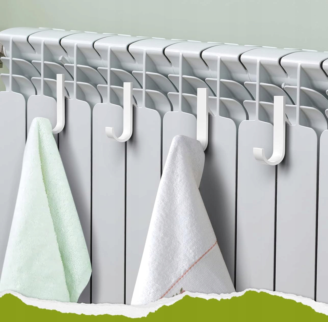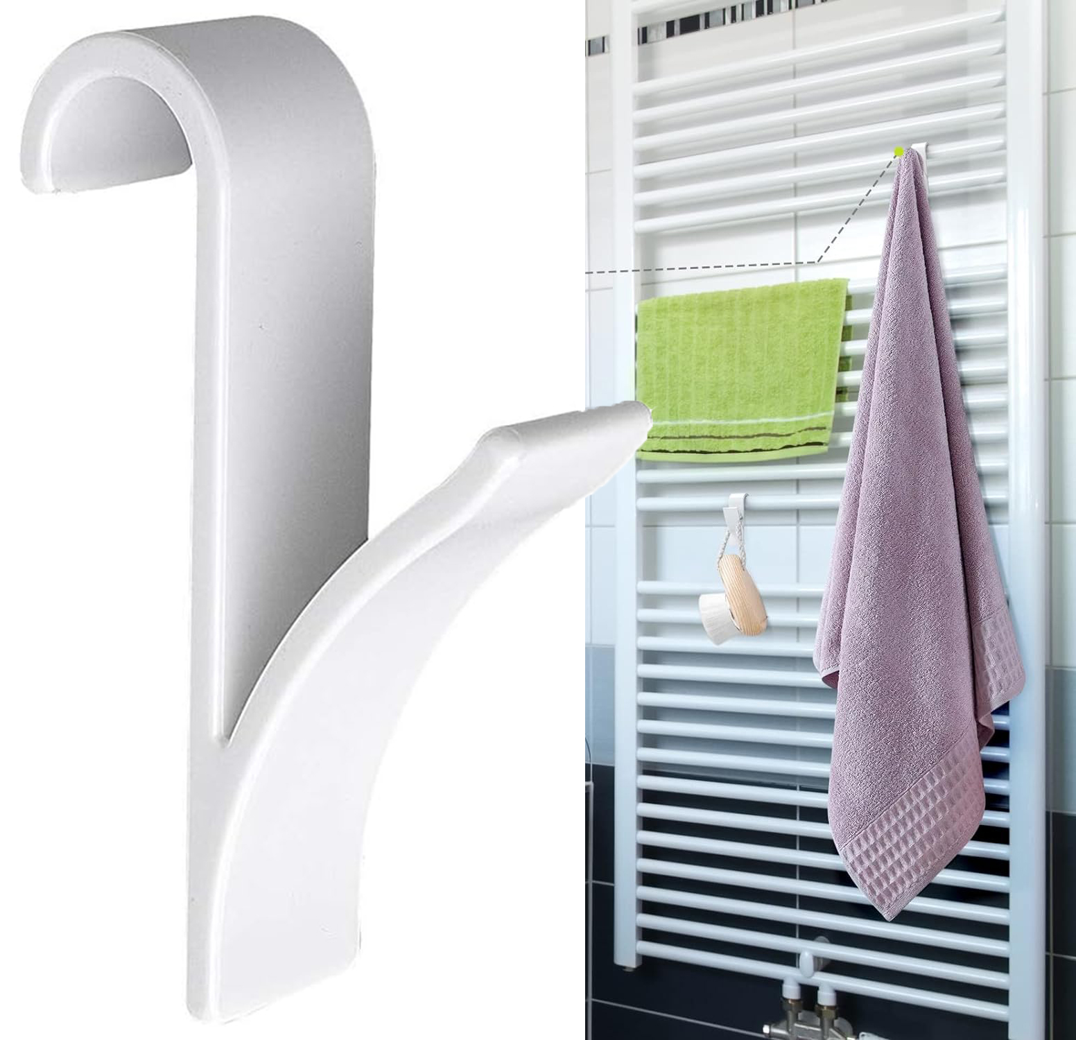 - з заокругленого кінця вона використовується для кріплення до решітки або ребер радіатора, а з прямої сторони використовується для розвішування рушника. У випадку радіаторів із панелями, розділеними на сектори, вішалку можна прикріпити догори дном