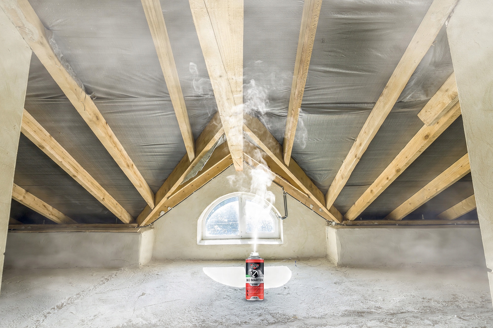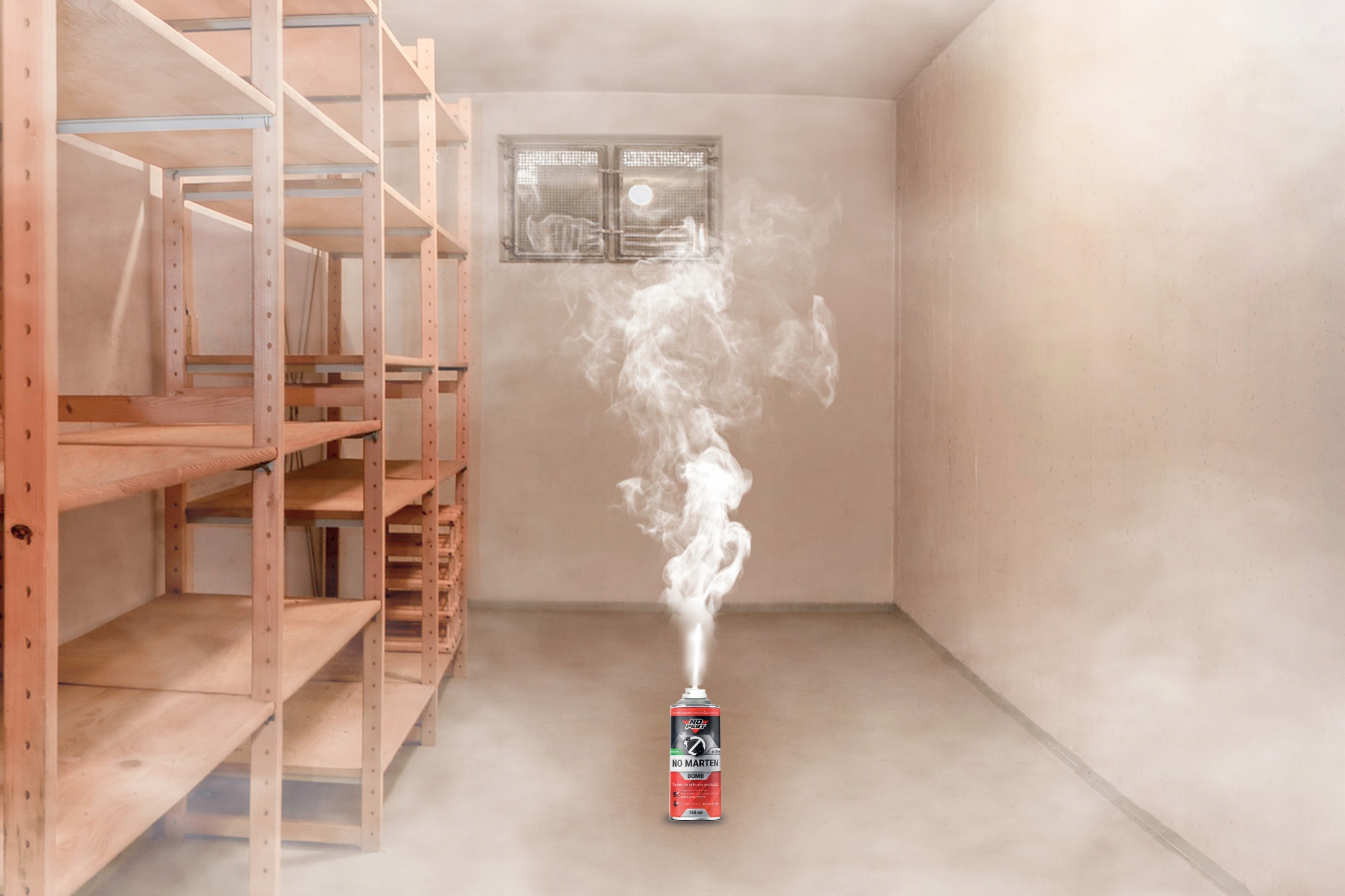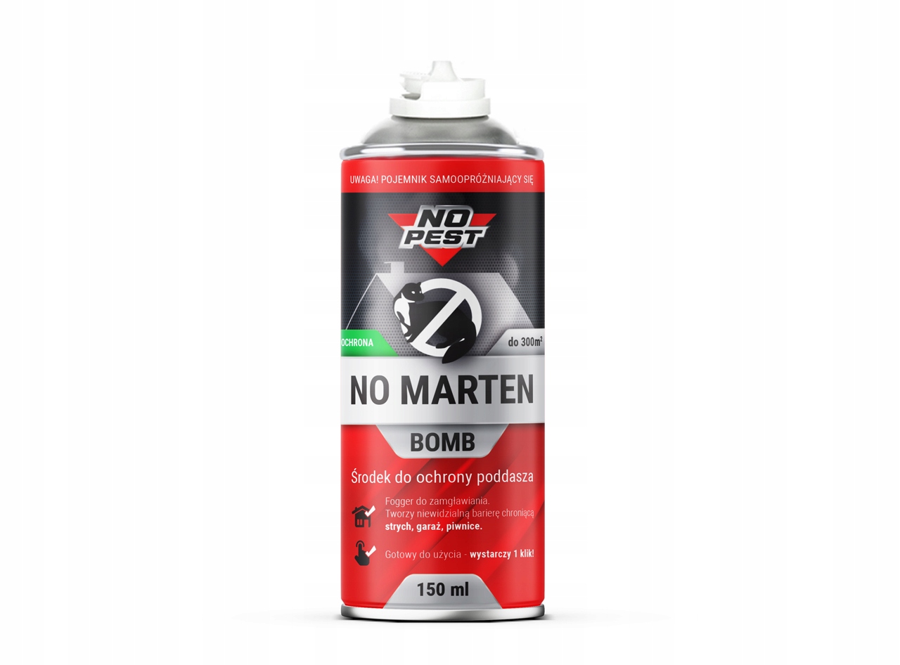 No Marten Bomb - безбарвний препарат у формі туманоутворювача для запотівання приміщень. Сильний концентрат захищає приміщення такі як горища, гаражі, підвали від нападів куниць, ласок, норок і гризунів.