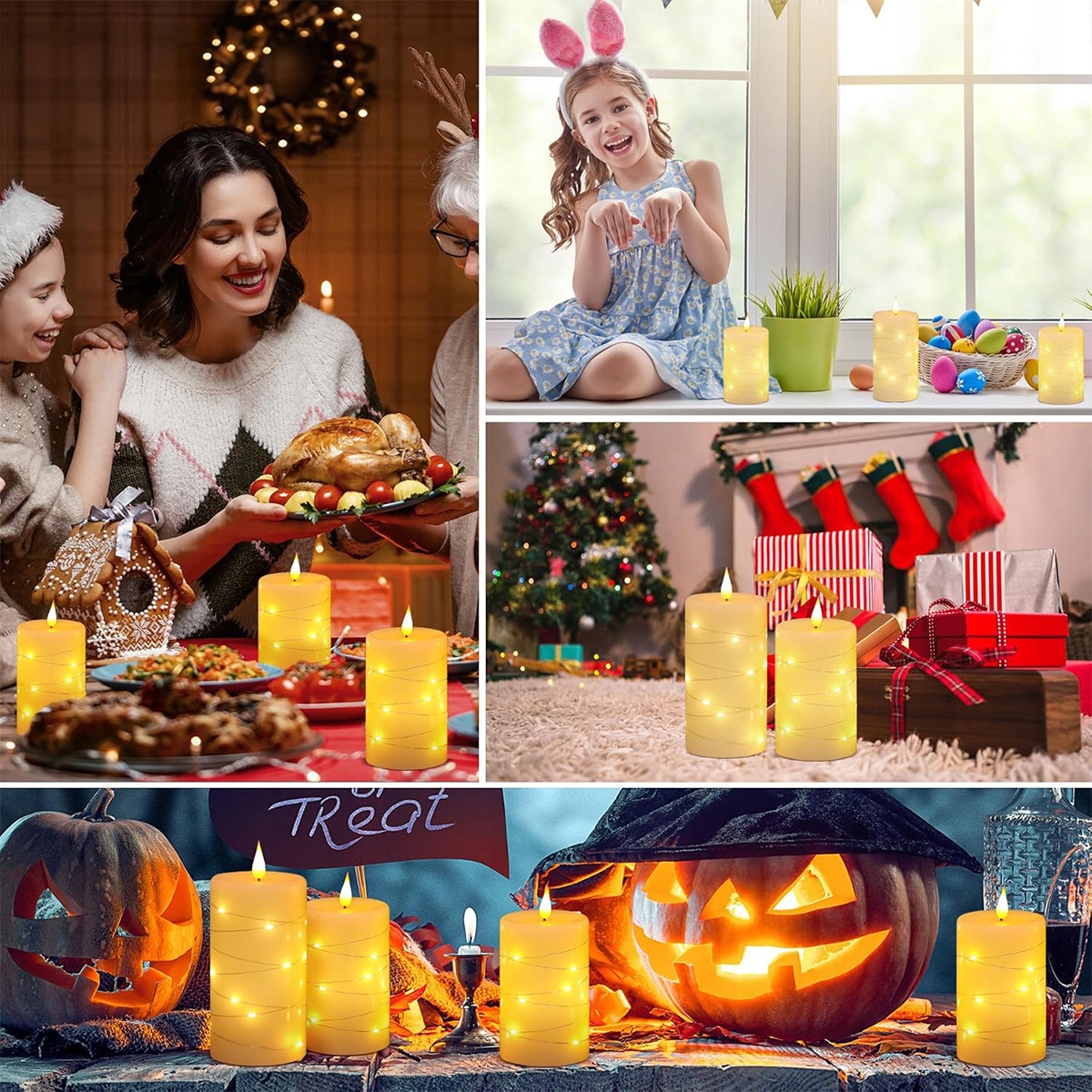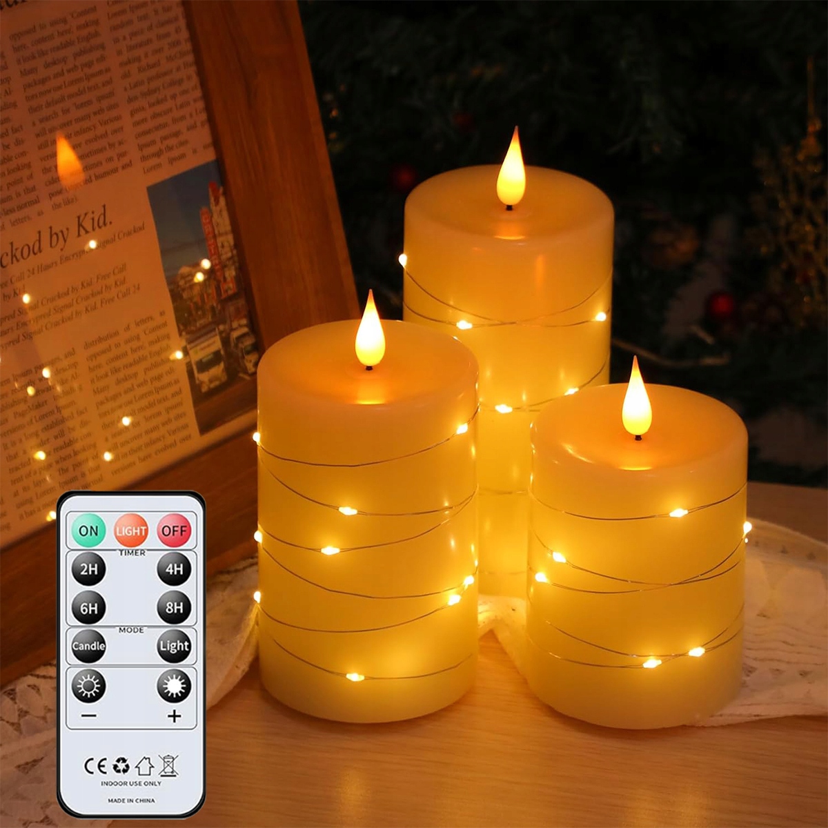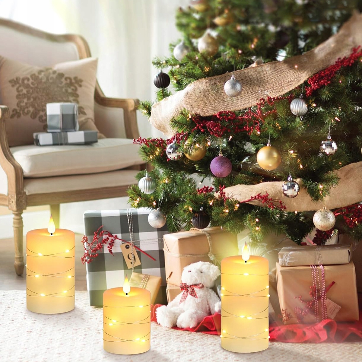 ⭐Мерехтливі безполум’яні свічки з різдвяними вогнями, свічки на батарейках із дистанційним керуванням і таймером, вбудовані світлодіодні різдвяні вогники теплого білого кольору, парафіновий віск кольору слонової кістки, прикраси для дому, набір із 3⭐🌟✨
