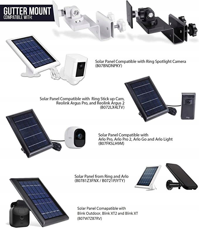 - Він також сумісний із версіями сонячної панелі Ring і Arlo (ASIN: B0781Z3FNX / B0721PJYTY).