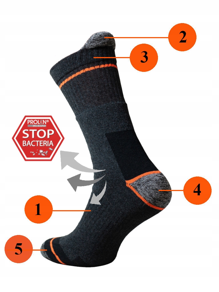 - Висока якість товста, антибактеріальна, бавовняне трикотне одяг, що забезпечує піт та гарну вентиляцію. Цей трикотаж утворився комбінацією бавовняної пряжі з антибактеріальною ниткою Siltex, яка має бактерицидні іони срібла. Завдяки цьому ми позбаємося від неприємного запаху під час тривалої роботи в цих шкарпетках і додатково захищаємо ноги та взуття.