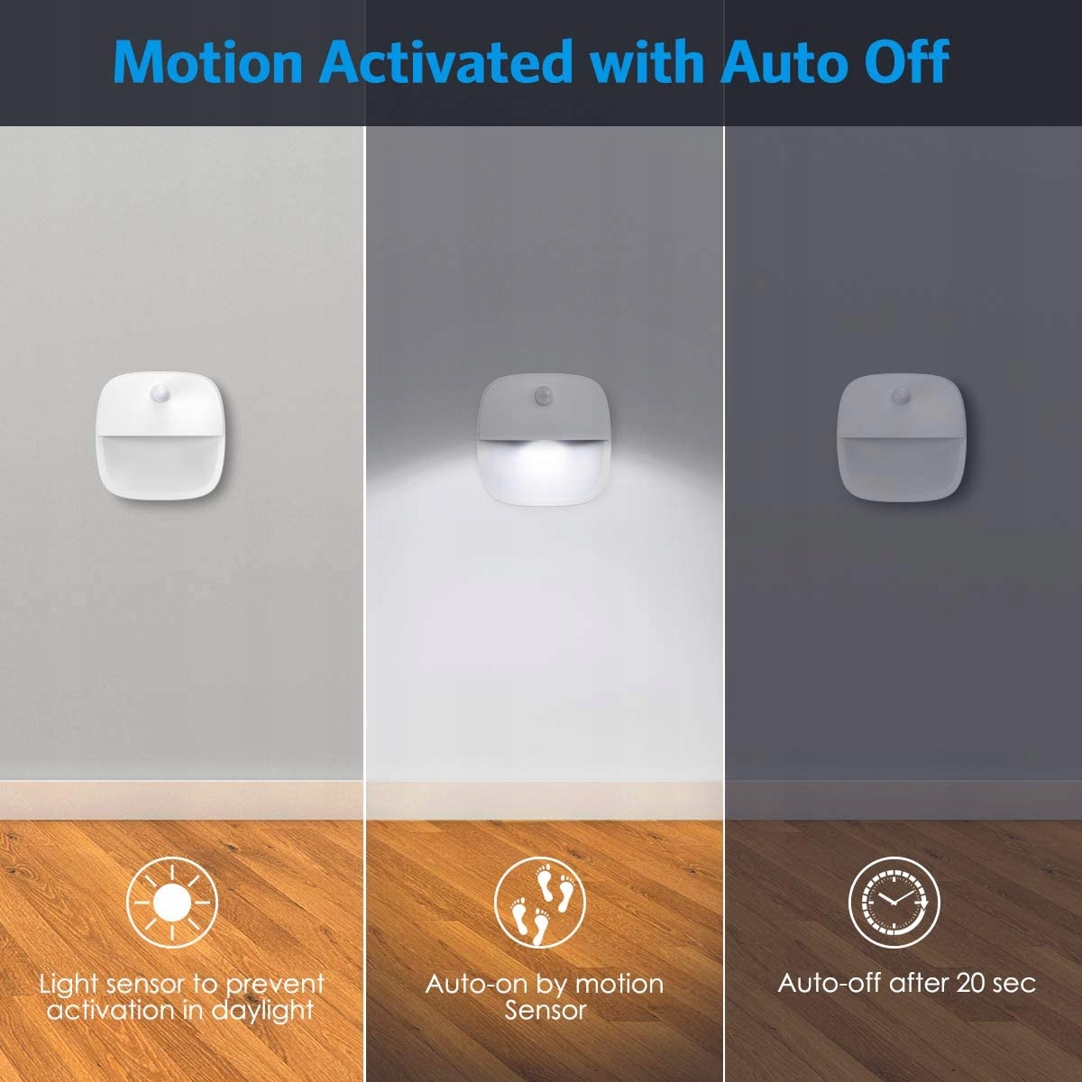Розумний датчик руху: ця лампа для виявлення руху використовує інфрачервону технологію PIR для виявлення руху людини в діапазоні 3 м/9,84 футів із кутом виявлення 120° та автоматично засвітиться, коли рух виявляється в темряві та автоматично вимикається через 20 секунд бездіяльності.