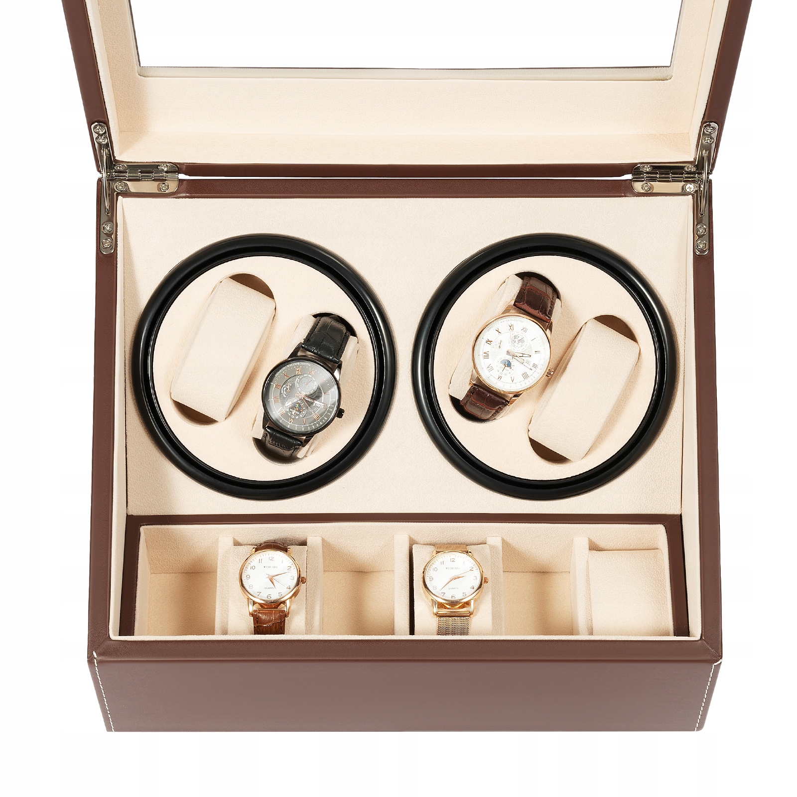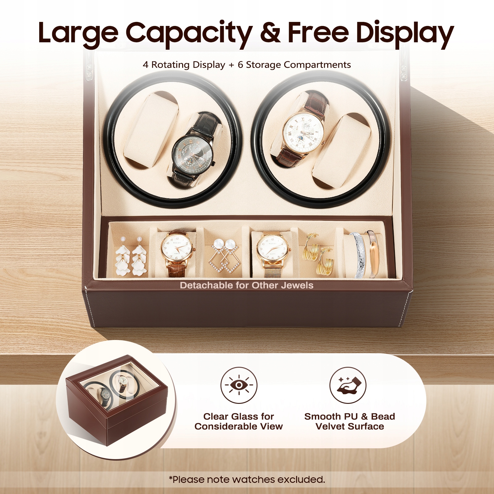 - Велика місткість: 4 відділення для дисплея, що обертаються, і 6 відділень дозволяють зберігати до десяти годинників одночасно. За допомогою одного пристрою для заводу годинника ви можете вирішити проблему зберігання годинника для себе та вашої сім’ї.