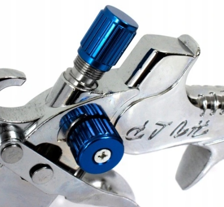 - air (setting the amount of material in relation to the air) Air regulation is done using an air regulator mounted in front of a pistol in a pneumatic network and more precisely using the knob in the lower part of the pistol ret (amount of material thrown) After selecting the appropriate nozzle and pressure of the product, it is possible to Подальше контролюйте витрати на вихід, змінюючи стрибок голки через ручку, розташовану в задній частині тіла.
