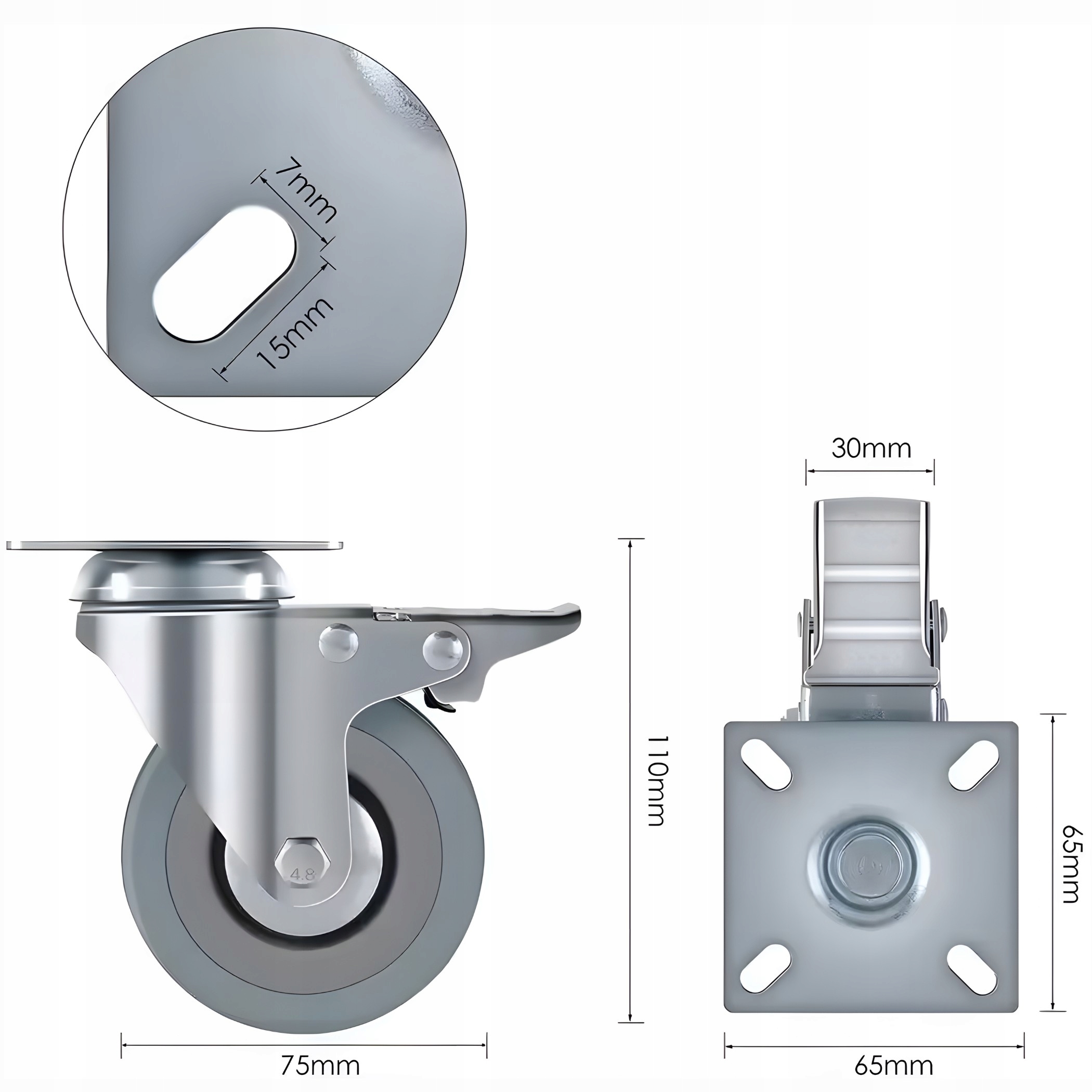 4 -кратні поворотні колеса 75 мм гумові валики з хромованим гальмівним набором