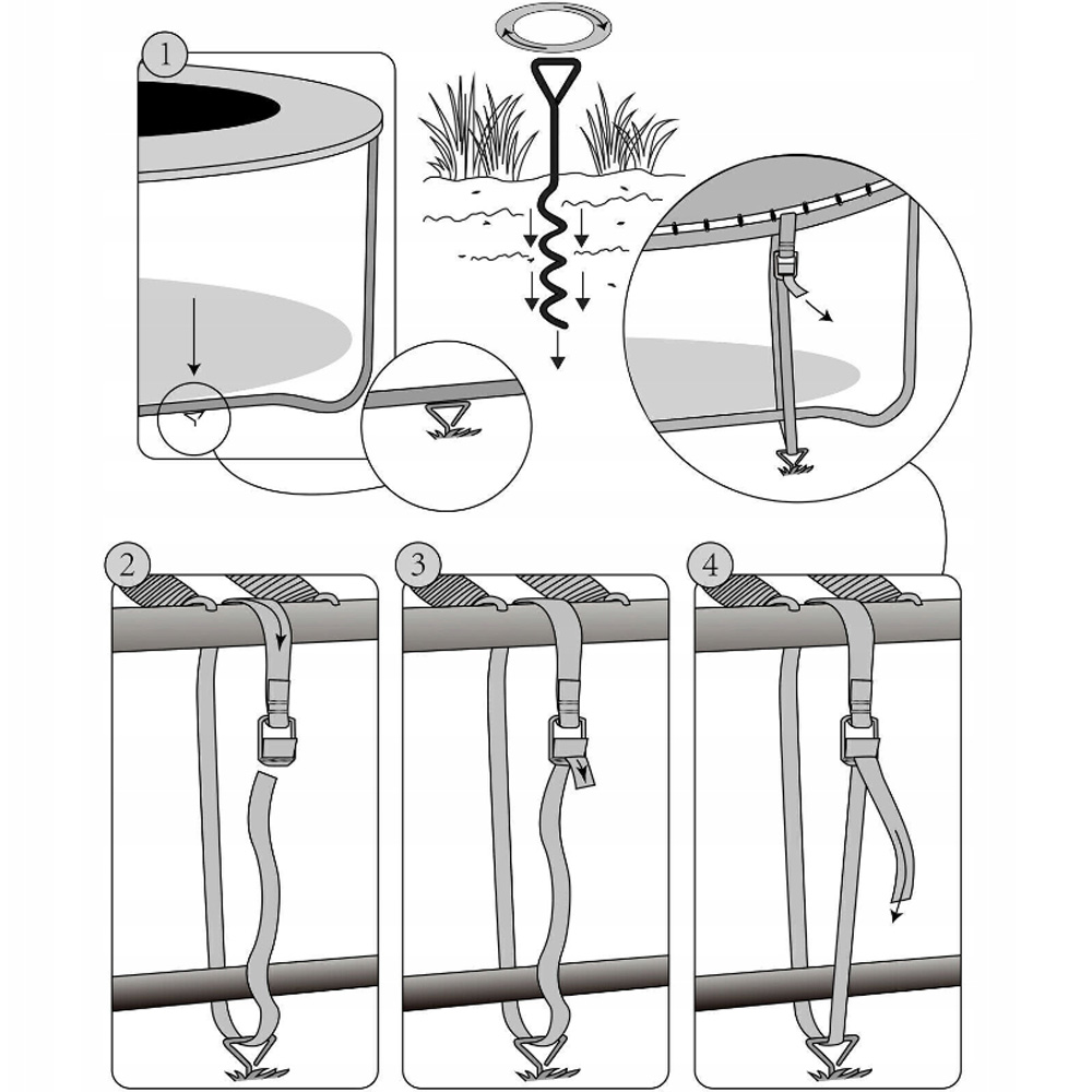 Цей набір для прикріплення якоря до батута ідеально підходить не тільки для кріплення батутів, але і для наметів, гойдалків, e-Z вгору, баскетбольних систем, дерев, захисних решітків та всіля гойдалки, якоря для єнота