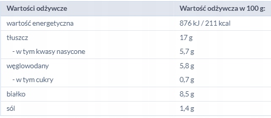 склад : вода, свинячий жир, механічно відокремлене м’ясо від 14%курки, курей 12%, свиняча печінка 5,5%, вінка з пшениці, серце від церков 3%, яйця, соєвий білок, сіль, модифікований крохмаль, часник 0,8%, цибуля, пік, спеції