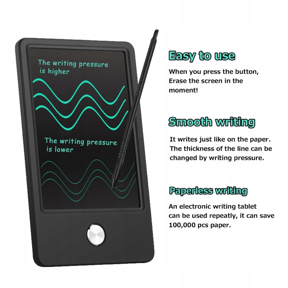 У РК-планшеті використовується надзвичайно гнучка рідкокристалічна технологія, яка базується на датчику тиску для відображення тексту, фотографій і графіки, і може бути стерта та записана понад 500 000 разів. • Стирання одним дотиком• Тримач стилуса (включно зі стилусом)• Міцний, стійкий до ударів пластиковий РК-дисплей• Змінна батарея• Ультратонкий, портативний• Поверхня для письма, чутлива до тиску• Письмо без паперу