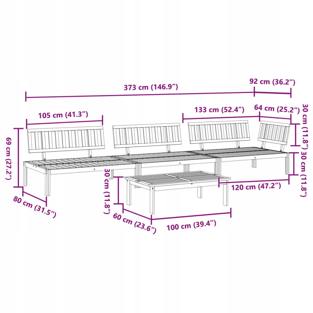 Цей дерев'яний диван складається з 1 столу та 3 диванів. Це ідеальний вибір для відпочинку на свіжому повітрі.
