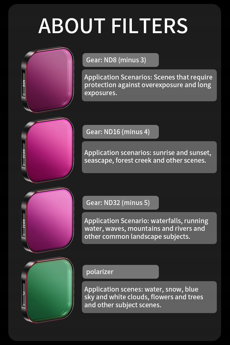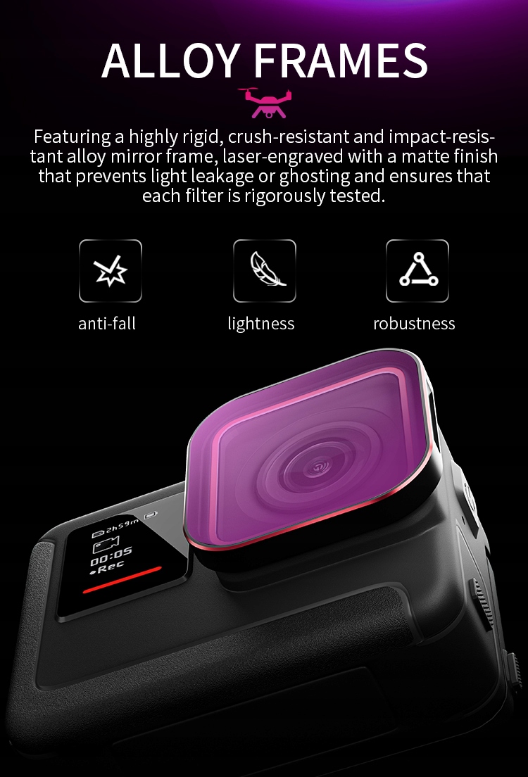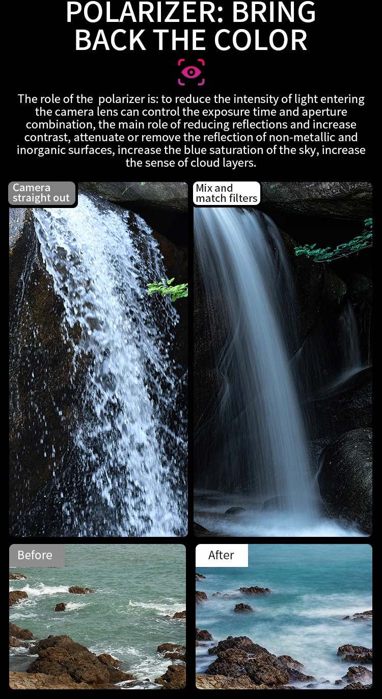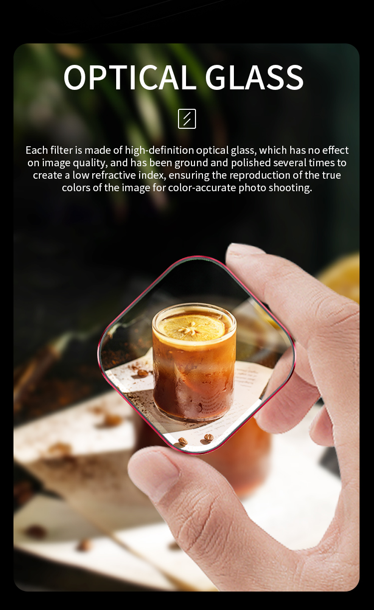 Оптичне скло високої роздільної здатності: кожен фільтр виготовлений з оптичного скла з високою роздільною здатністю та низького показника заломлення, що гарантує вірне відтворення кольору та високоякісні зображення. Премія: Виготовлений з алюмінію повітряного класу, рама є лазерною, враховується і має матове, чорне покриття, що запобігає входу світла та ефекту привидів, забезпечуючи фотографії професійної якості.