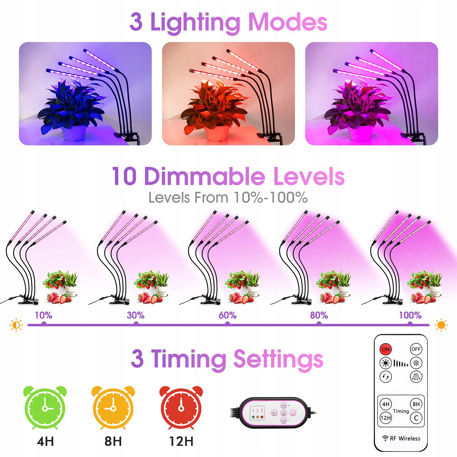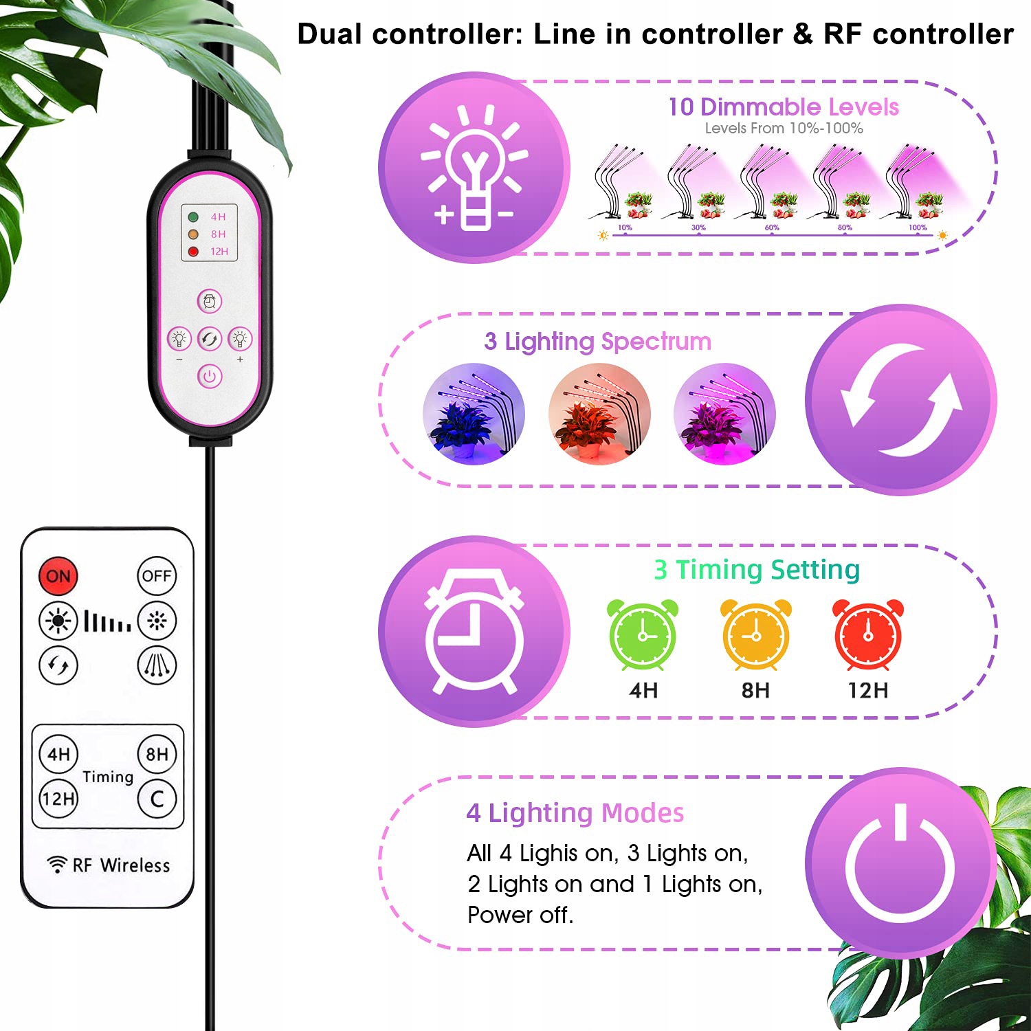 4-головий світлодіодний світильник для рослин з міцним затискачем, дистанційним керуванням