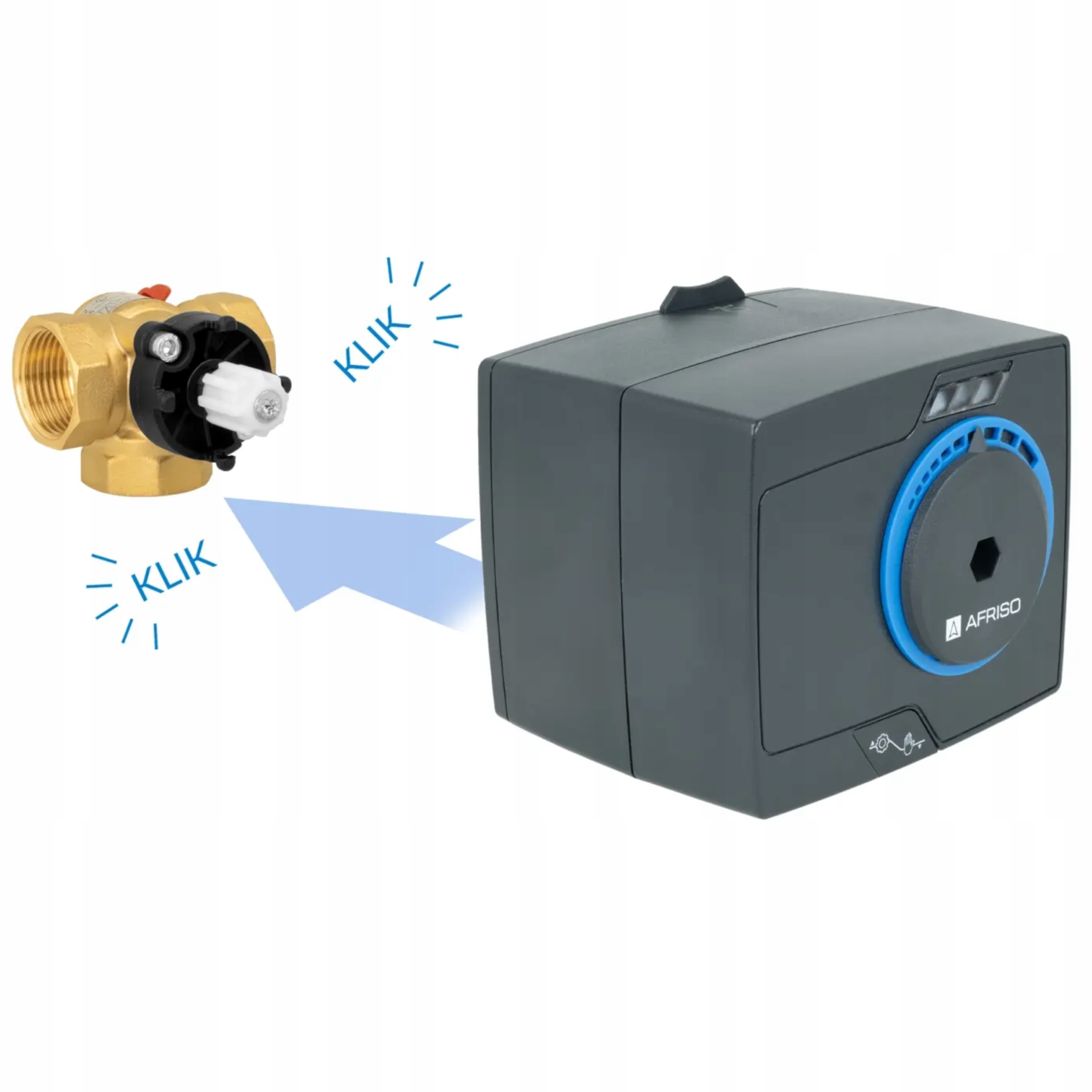 відрізняється сучасним дизайном і привабливим зовнішнім виглядом. Позначення на синьому кільці приводу вказують на положення дзеркала змішувального клапана. Ручне обертання клапана можливо завдяки використанню спеціальної муфти. Зрозуміла схема електричного підключення розташована збоку приводу. Не вимагає обслуговування. Поставляється з електричним кабелем 2 м.