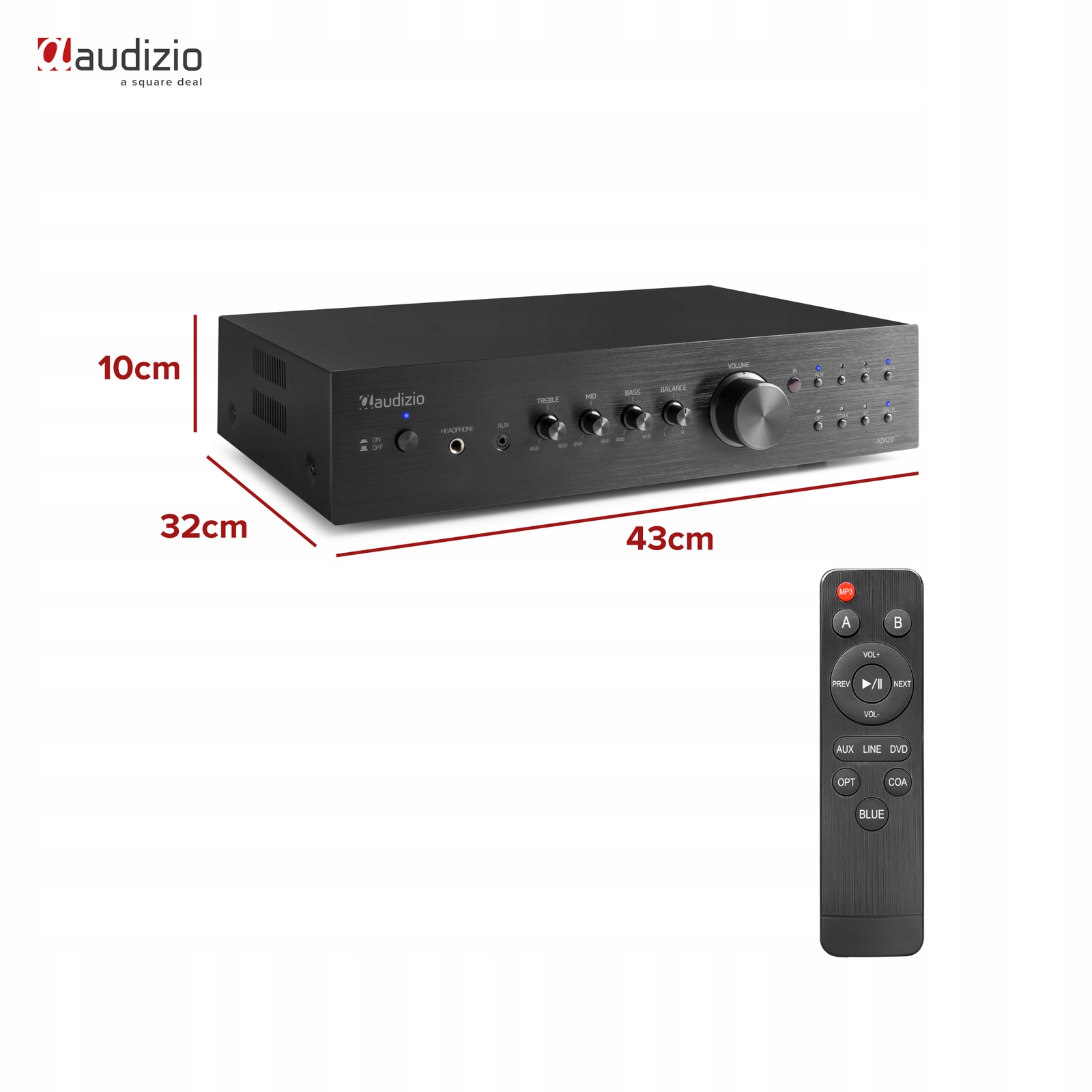 Звичайно, однією з найважливіших властивостей Hi-Fi установки є звук. І хоча кінцевий звук залежить не лише від підсилювача (а й від динаміків та/або пропонованого сигналу), хороший підсилювач, звичайно, дуже важливий. Audizio AD420B - це підсилювач класу A/B з дуже теплим і детальним звуком. Крім того, з точки зору потужності вам нічого не бракуватиме, маючи не менше 4x 100 Вт потужності, ви також можете насолоджуватися хорошою гучністю. У поєднанні з хорошим набором динаміків Hi-Fi слухати AD420B гарантовано буде приємно. На передній панелі підсилювача ви можете легко вибрати набір динаміків, які хочете слухати (A, B або A/B).
