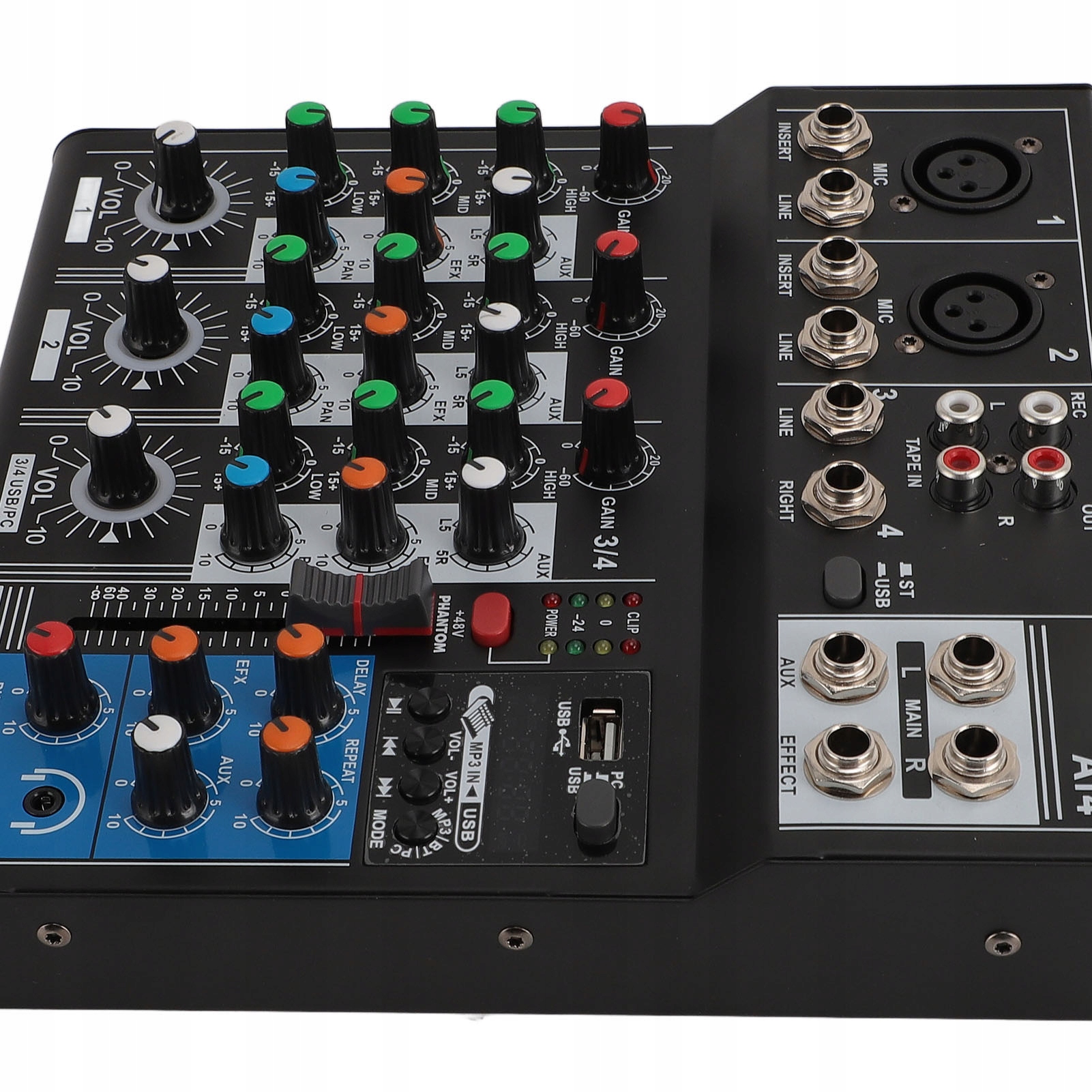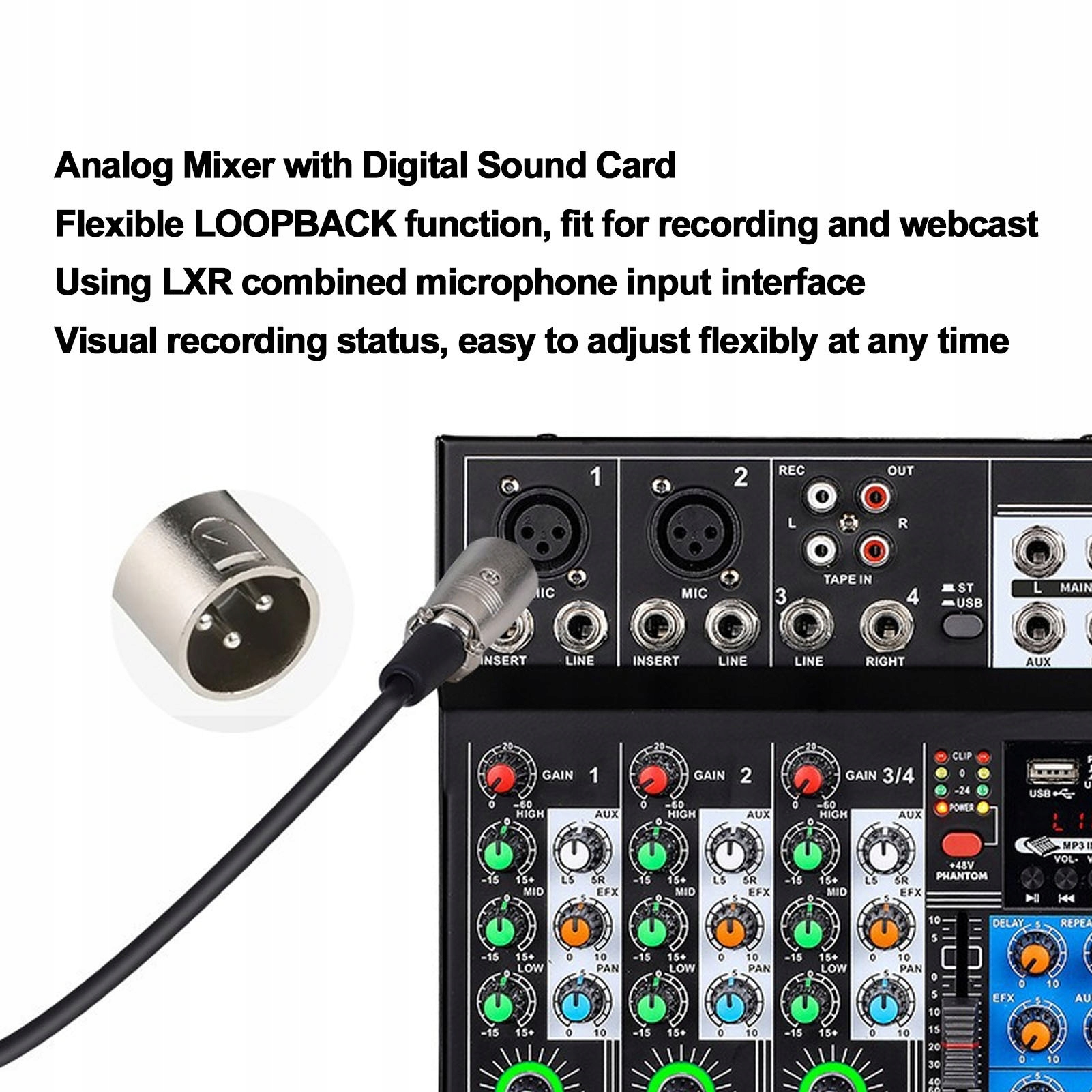 1. Сумісність з багатьма пристроями: 4-канальна консоль змішування має функцію бездротового потоку BT, яка може підтримувати як вхід для змішування сигналів з іншими вхідними каналами, придатними для iOS, Android, планшетів та MP3-плеєрів. Вхідне інтерфейс: Ця консоль змішування оснащена нахабним XLR та збалансованими вхідними інтерфейсами з точками вставки. Збалансований вхід XLR можна підібрати до стандартного чоловічого, Z +48 В для фантомного джерела живлення. Світлодіодна лампа та поворот: Цей звуковий інтерфейс USB -змішувача оснащений світлодіодною лампою та поворотним поворотом, з вибором входу, регулюванням лайна, незалежним балансовим каналом та регулюванням високої, верхньої та низької частоти. Зручний і практичний: ультра тонкий дизайн корпусу та герметичний пристрій керування поворотом - Pyoszczyne та витримують. Вони забезпечують комплексне контроль динаміки, що підходить для сценічних виступів та відтворення звуку на рівні студії. Методи живлення: за допомогою кабелю живлення USB ви можете керувати змішувальною консоллю до пристроїв живлення, таких як комп'ютери, портативне джерело живлення та підключення, забезпечення високої сумісності та простих випаровування.