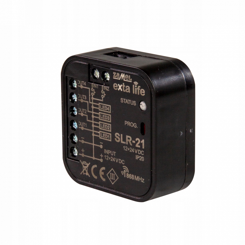 Контролер SLR-21 є останнім елементом системи exta life, яка дозволяє незалежно керувати чотирма світлодіодними ланцюгами 12-24 В постійного струму. Призначений для створення світлових композицій на одноколірних світлодіодних стрічках. Окрім стандартної функції увімкнення/вимкнення, також є можливість плавно регулювати яскравість у кожному каналі. Настроювані часи ввімкнення, вимкнення та освітлення/затемнення дозволяють краще адаптувати поведінку контролера до вимог користувача. Двонаправлений зв'язок з контролером EFC-01 означає, що в мобільному додатку завжди відображається поточний стан приймача, можна змінювати його вибрані параметри та дистанційно додавати передавачі (без доступу до приймача). Алгоритм кадрового кодування забезпечує безпеку управління. Окрім контролера, SLR-21 можна паралельно керувати з передавачів системи exta life. У приймач можна ввести більшу кількість передавачів, що дозволяє здійснювати незалежне керування з кількох місць. Пристрій призначений для монтажу в під- та накладні монтажні коробки. Додаткові конфігуровані дротові входи розширюють функціональність управління. У приймачі реалізована функція дистанційного оновлення ПЗ з рівня контролера.