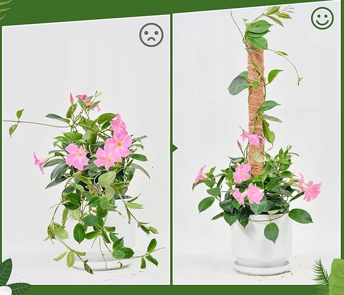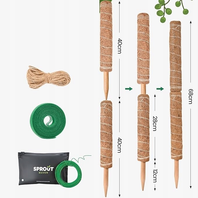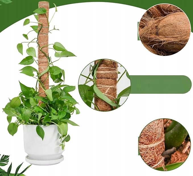- Посилений захист і можливість багаторазового використання: внутрішній стрижень стовпа з моху виготовлено з труби ПВХ, яка не гниє. Це робить кол більш стійким і довговічним. Загострені кілки зроблені з дерева і мають достатню довжину, щоб забезпечити міцну фіксацію рослини. Мотузка, обмотана навколо стовпа, притягує кокосовий мох, забезпечуючи тривале використання.